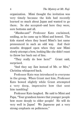 organization. Mimi thought the invitation was very timely because the kids had recently learned so much about Japan and wanted to go there. So she accepted—and here they were, sore bottoms and all. “Mashu-san!” Professor Kato exclaimed, smiling, as he came up to Mimi and bowed. The kids stared when they heard Mimi’s last name pronounced in such an odd way. And their mouths dropped open when they saw Mimi slowly attempt a bow, looking like she didn’t want to throw her back out of line. “They really do bow here!” Grant said, surprised. “And they say San instead of Mr. or Mrs,” Christina whispered back. Professor Kato was introduced to everyone in the group. When Grant met him, Professor Kato bowed slightly while Grant attempted a very deep, impressive bow that sent him tumbling! Professor Kato laughed. He said to Mimi and Papa, “Your grandson knows that younger people bow more deeply to older people! He will do very well in Japan! We Japanese put a very strong emphasis on politeness.”