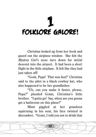 1 Folklore Galore! Christina looked up from her book and gazed out the airplane window. She felt the Mystery Girl’s nose turn down for initial descent into the airport. It had been a short flight in the little airplane. It felt like they had just taken off! “Gosh, Papa! That was fast!” Christina said to the pilot in a black cowboy hat, who also happened to be her grandfather. “Uh, can you make it faster, please, Papa?” pleaded Grant, Christina’s little brother. “I gotta go! Say, when are you gonna get a bathroom on this plane?” Mimi giggled at her grandson squirming in his seat, his face twisted in discomfort. “Grant, I told you not to drink that 11
