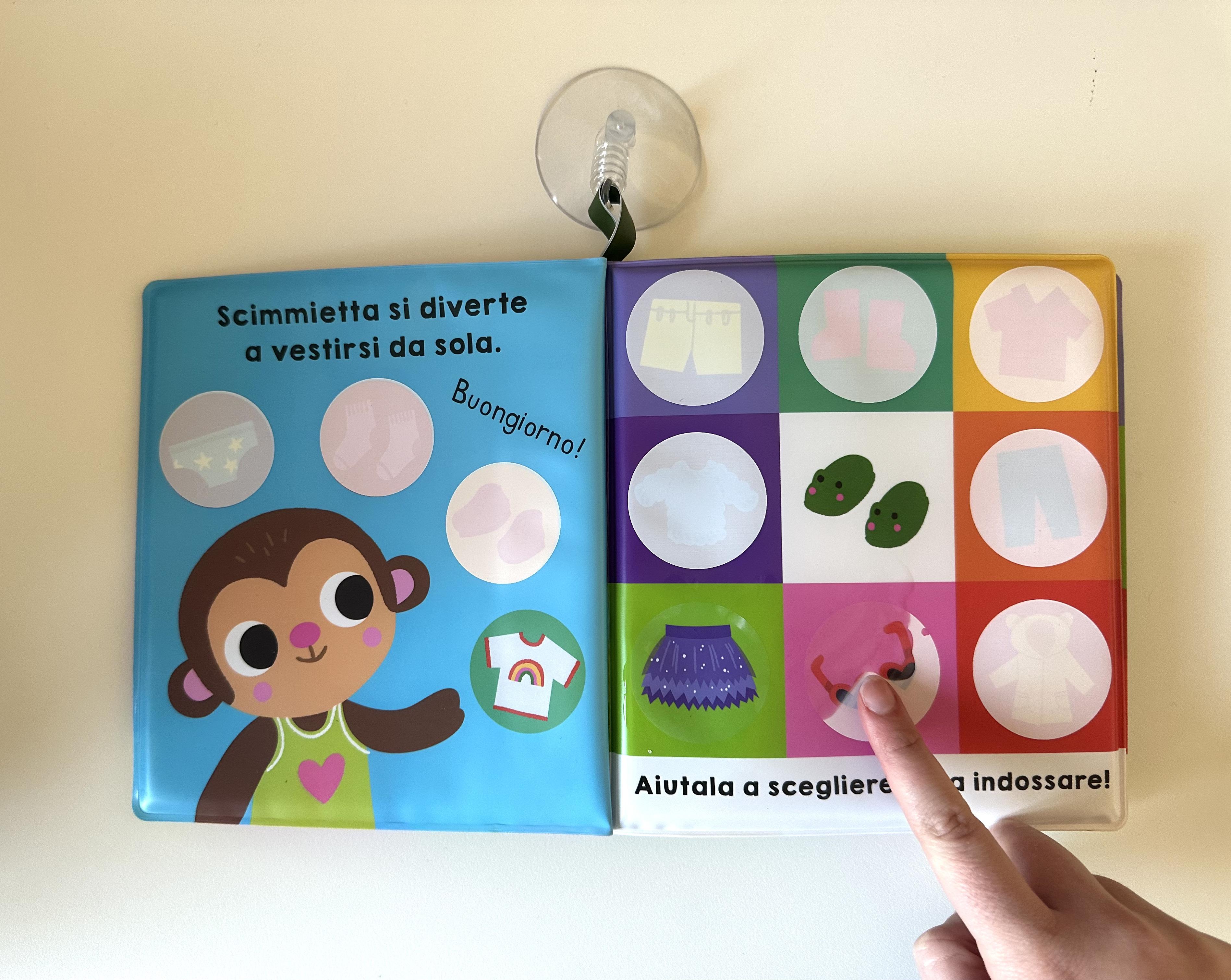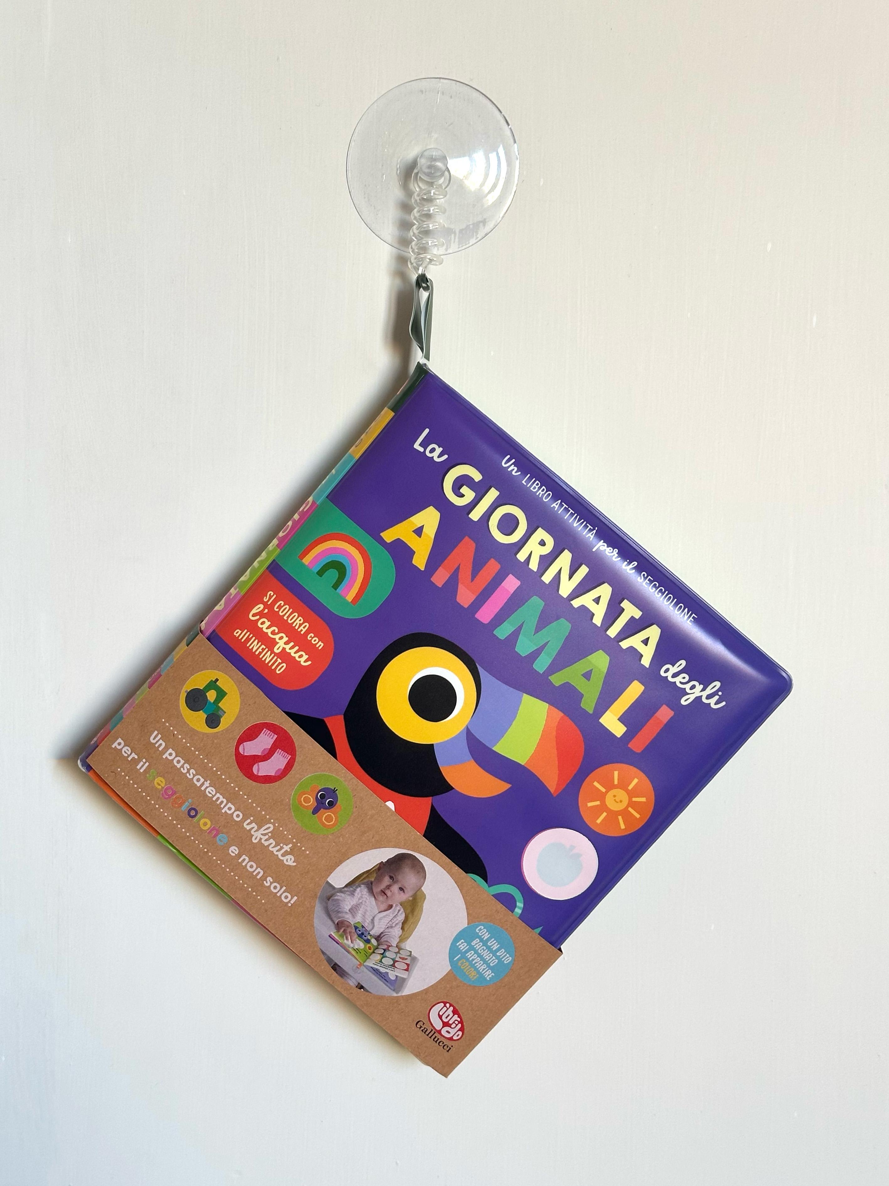 Il libro attività ideale per giocare sul seggiolone! Basta bagnare le pagine con un dito e le figure nascoste sotto le sagome bianche appariranno come per magia!