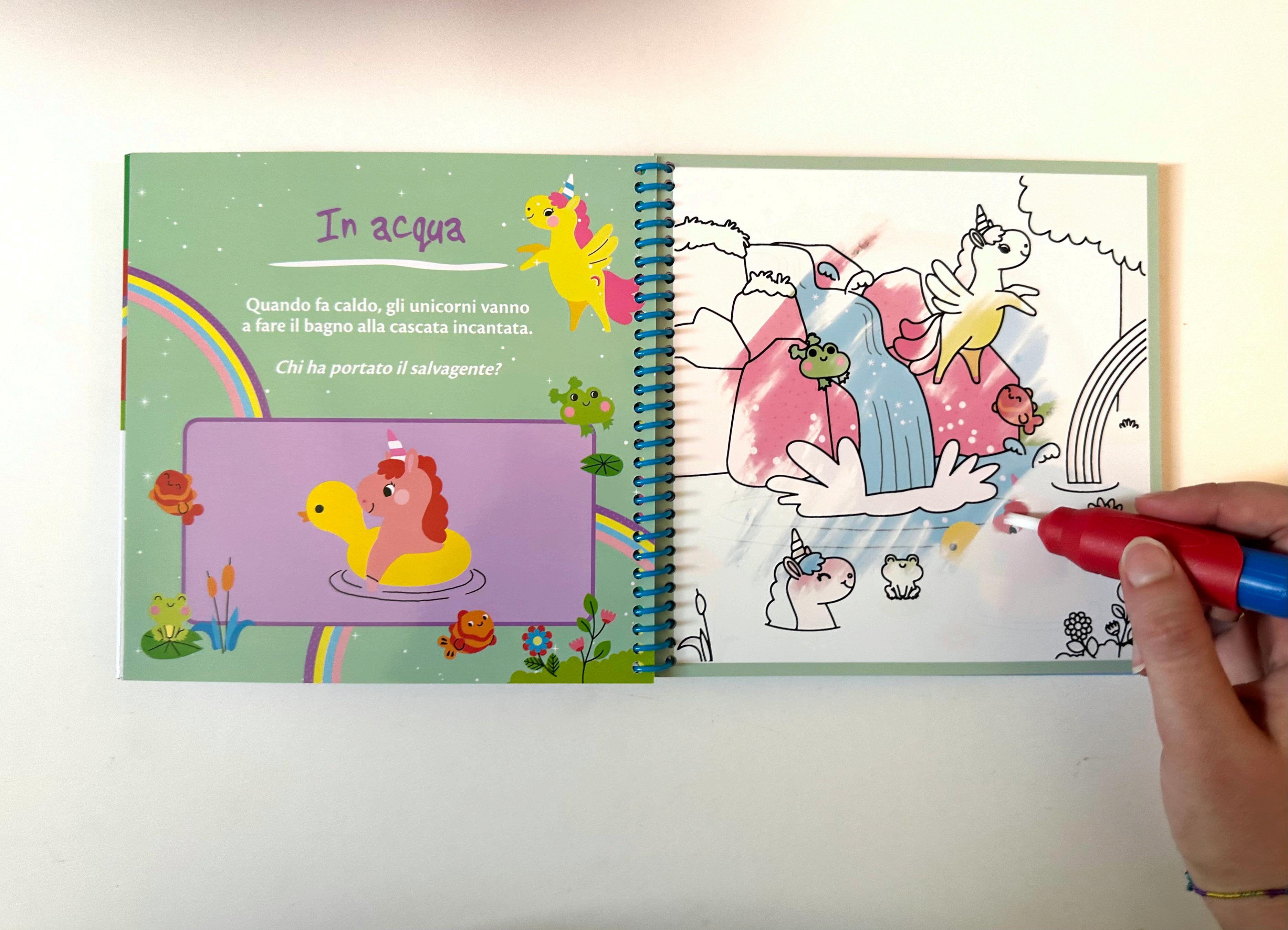Dipingi con l’acqua e i colori appariranno. Aspetta che il disegno asciughi e ricomincia all’infinito!