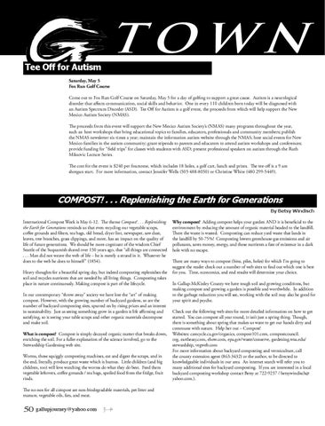 Why compost? Adding compost helps your garden AND it is beneficial to the environment by reducing the amount of organic material headed to the landfill. There the waste is wasted. Composting can reduce yard waste that lands in the landfill by 50-75%! Composting lowers greenhouse-gas emissions and air pollutants, saves money, energy, and those nutrients a fate of existence in a dark hole with no escape. There are many ways to compost (bins, piles, holes) for which I’m going to suggest the reader check out a number of web sites to find out which one is best for you. Time, economics, and end results will determine your choice. In Gallup-McKinley County we have tough soil and growing conditions, but making compost and growing a garden is possible and worthwhile. In addition to the garbage reduction you will see, working with the soil may also be good for your spirit and psyche. Check out the following web sites for more detailed information on how to get started. You can compost all year round, it isn’t just a spring thing. Though, there is something about spring that makes us want to get our hands dirty and commune with nature. Help her out – Compost! Websites: carecycle.ca.gov/organics, compost101.com, compostcouncil. org, eartheasy.com, ehow.com, epa.gov/waste/conserve, gardening.wsu.edu/ stewardship, vegweb.com For more information about backyard composting and vermiculture, call the county extension agent (863-3432) or the author, to be directed to knowledgeable individuals in our area. An internet search will refer you to many additional sites for backyard composting. If you are interested in a local backyard composting workshop contact Betsy at 722-9257 / betsywindisch@ yahoo.com.).