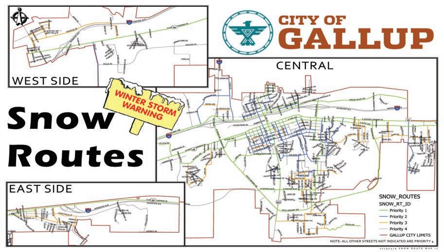 The city of Gallup crews will begin to clear snow from priority 1 roads first. Priority1 roads include those around schools, main arteries, hospital routes and hills. Priorities (2 – 4) will follow suit once the priority 1 roads are cleared. The city tries to have all roads cleared within 10 hours, unless the storm is prolonged. Then, priority roads take precedence and other streets (cul-de- sacs and dead-end streets) will be cleared when conditions allow. The first pass of the plow is to open the roads then crews will go back and push the snow back to the curb. Salting starts when one inch of snow build up is present on the street or, in areas with steep streets, just before a major storm arrives. Salt is generally applied only on hills and at intersections. Snow plowing starts when two or more inches of snow accumulate on streets.