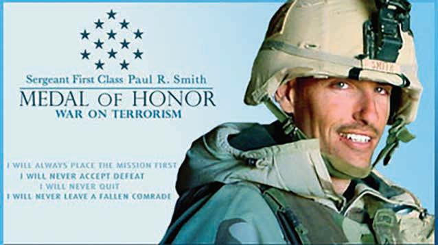 The first Medal of Honor Flag recipient was U.S. Army Sergeant First Class, Paul R. Smith. SFC Smith’s Medal of Honor and MOH Flag were presented posthumously by then President George W. Bush to SFC Smith’s son David on 4 April 2005.