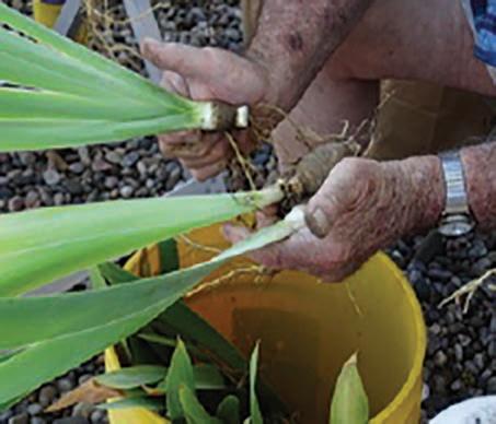hands. The clump may look like a gnarly mess but there is logic to it. In the center is the “mother rhizome”, which in many cases will not have any leaves. It looks like a potato with other smaller potatoes attached. Start working from the outside, breaking apart each clump in separate rhizomes. Any rhizome with a blossom stalk attached will not bloom again and is discarded. All of the inner rhizomes without leaves are also discarded. You will still have a good number of rhizomes with leaves when you are done.