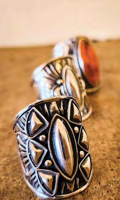 Derrick Gordon is a local silversmith with 35 years of experience. His style incorporates both traditional and contemporary designs. In 1989, during his senior year, he assisted his uncle, Delbert Gordon, with bezeling and cutting for a couple of years. After that, he worked at Running Bear as a silversmith for nine years, handling simple repairs. In 2010, he left the company to start his own independent venture, Derrick Gordon Jewelry, creating exquisite pieces that strike a balance between tradition and modernity.