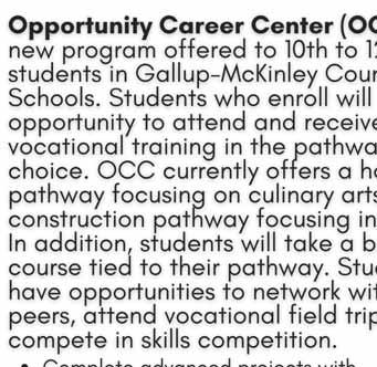 The Center will have a multitude of Career Pathways, including auto and diesel mechanics, trade work including welding, electrical, and HVAC, and civic duty roles such as police and fi refi ghters. Medical field opportunities will also be available, but the University of New Mexico Gallup will run those programs.