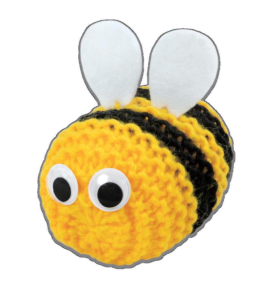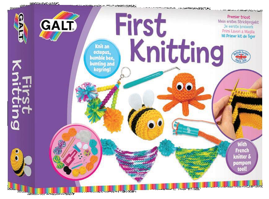 • Create a knitted bumblebee, pompom bunting, octopus, and pompom keyring following the step-by-step guide.