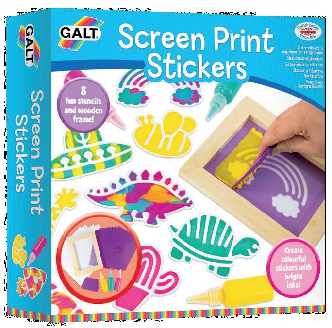 • Create stickers using the screenprinting frame, 8 stencils and 3 vibrant inks.