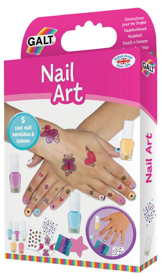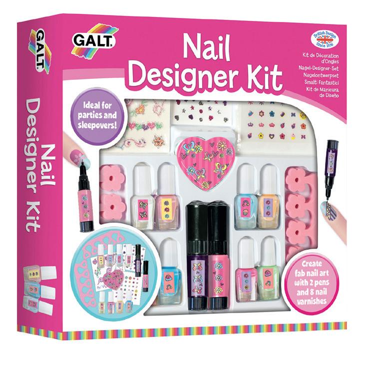 • A collection of 7 colours of nail varnish and 2 nail pens to create unique designs.