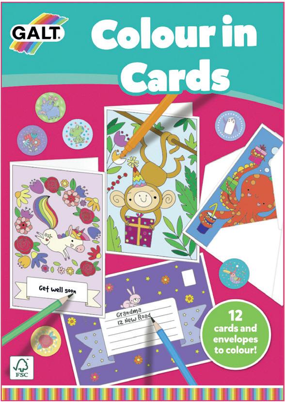Contents: 8 printed cards, star punch, 2 gel pens, 1 coloured card, 2 scratch art pre-cut card pieces, 4 sheets of pre-cut card pieces, 5 sheets of card motifs, patterned paper, foil paper, 10 coloured envelopes, sticker sheet, self-adhesive shaker dome, sequins, scratch art tool, sticky gems, wiggly eyes, lolly stick, sticky pads, sticky tape, illustrated guide.