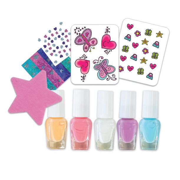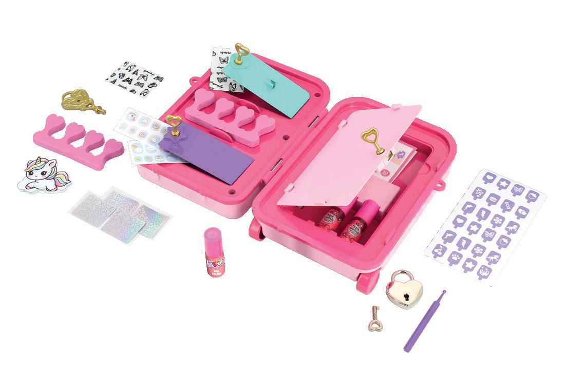 Contents: 8 nail varnishes (7 colours and 1 glitter), 2 nail pens, nail stickers, nail gems, tattoo transfers, 2 foam toe