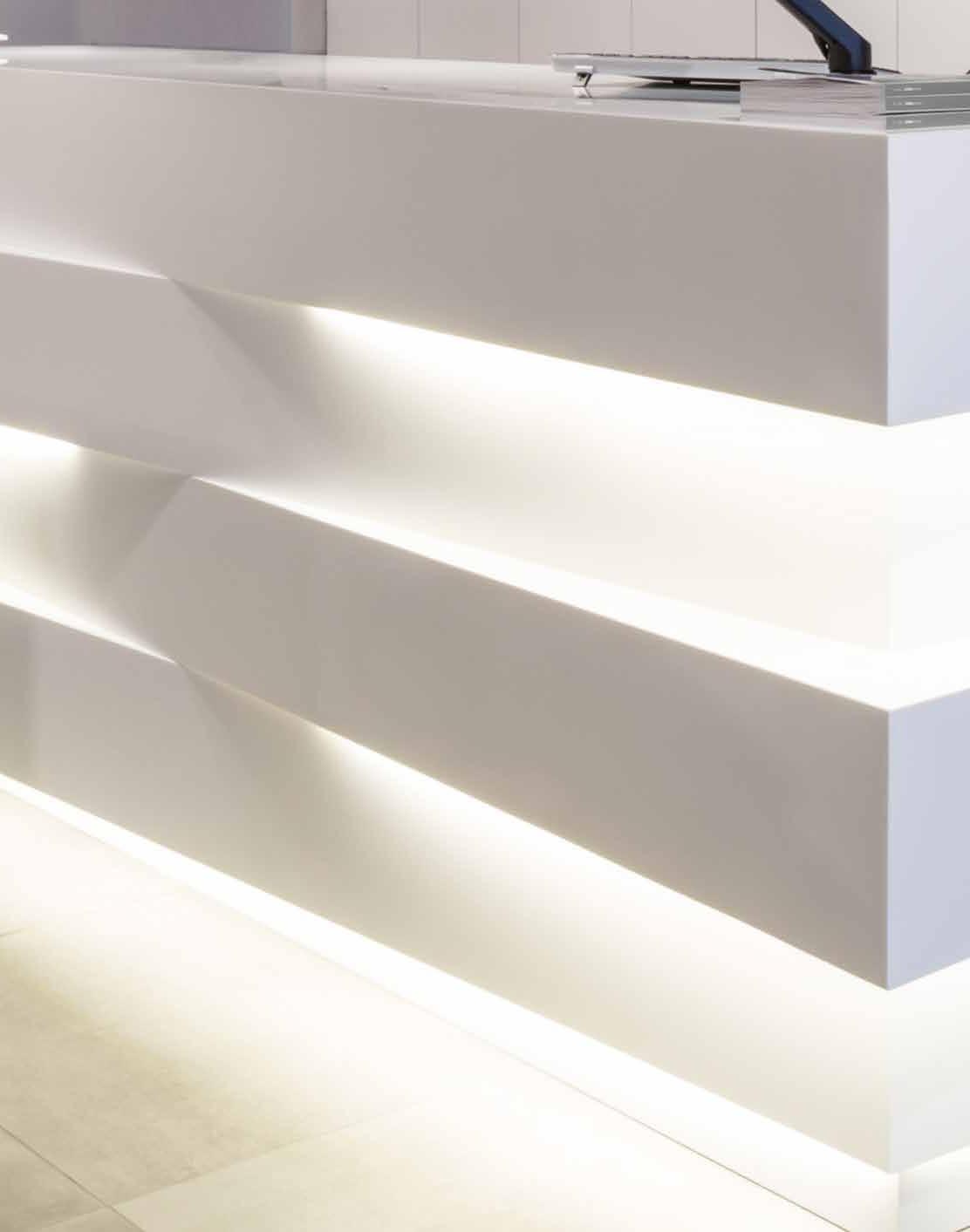 BETACRYL FLEX se puede usar como una superficie sólida tradicional en arquitectura y diseño de productos, pero mejora sus calidades específicas para todas las creaciones curvas: en el campo de la salud, en entornos de laboratorio y para cualquier instalación donde se requiera la máxima ductilidad e higiene.