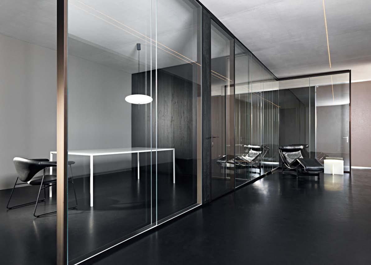 Trennwandsystem für Innenräume aus Aluminium und Glas mit kompakten Abmessungen und einer Dicke von 35 mm bei Einfachverglasung und 50 mm bei Doppelverglasung. Système continu de cloison intérieure en aluminium et verre, de petites dimensions, avec une épaisseur de 35 mm en simple vitrage et de 50 mm en double vitrage.