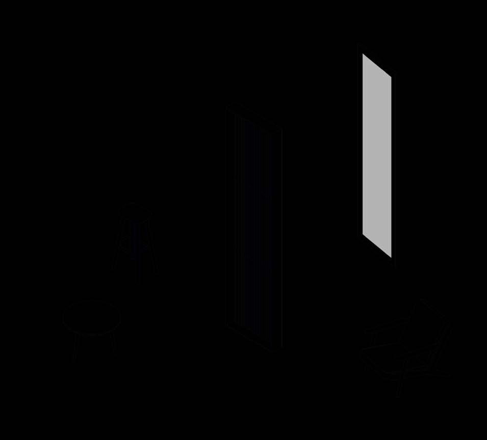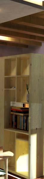 The area divided into 3 zones; private space, public area, and also service. The main feature of this house is big cabinet as divider from living area and sleeping area.
