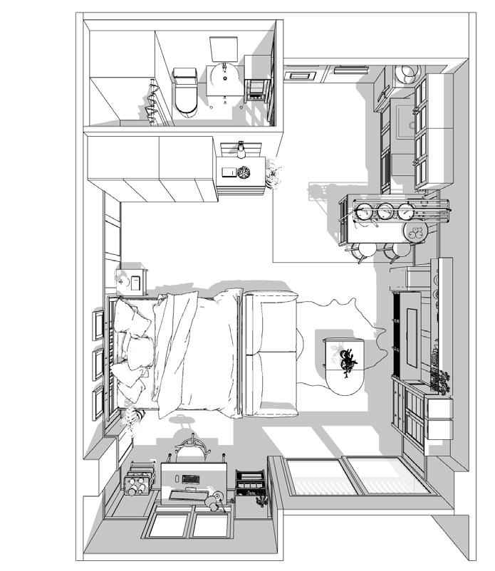 All of the exisiting walls were changed into a spacious area, which were divided into bathroom and living space. This space contains kitchen, pantry, living area, bedroom, workspace, and a small balcony.
