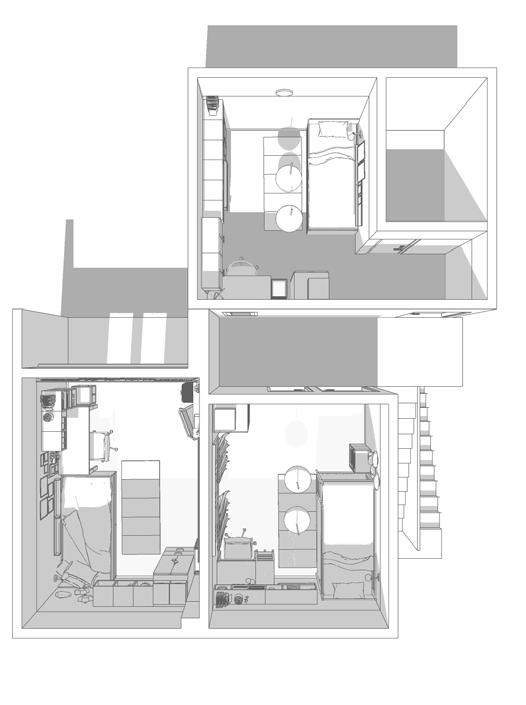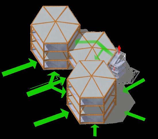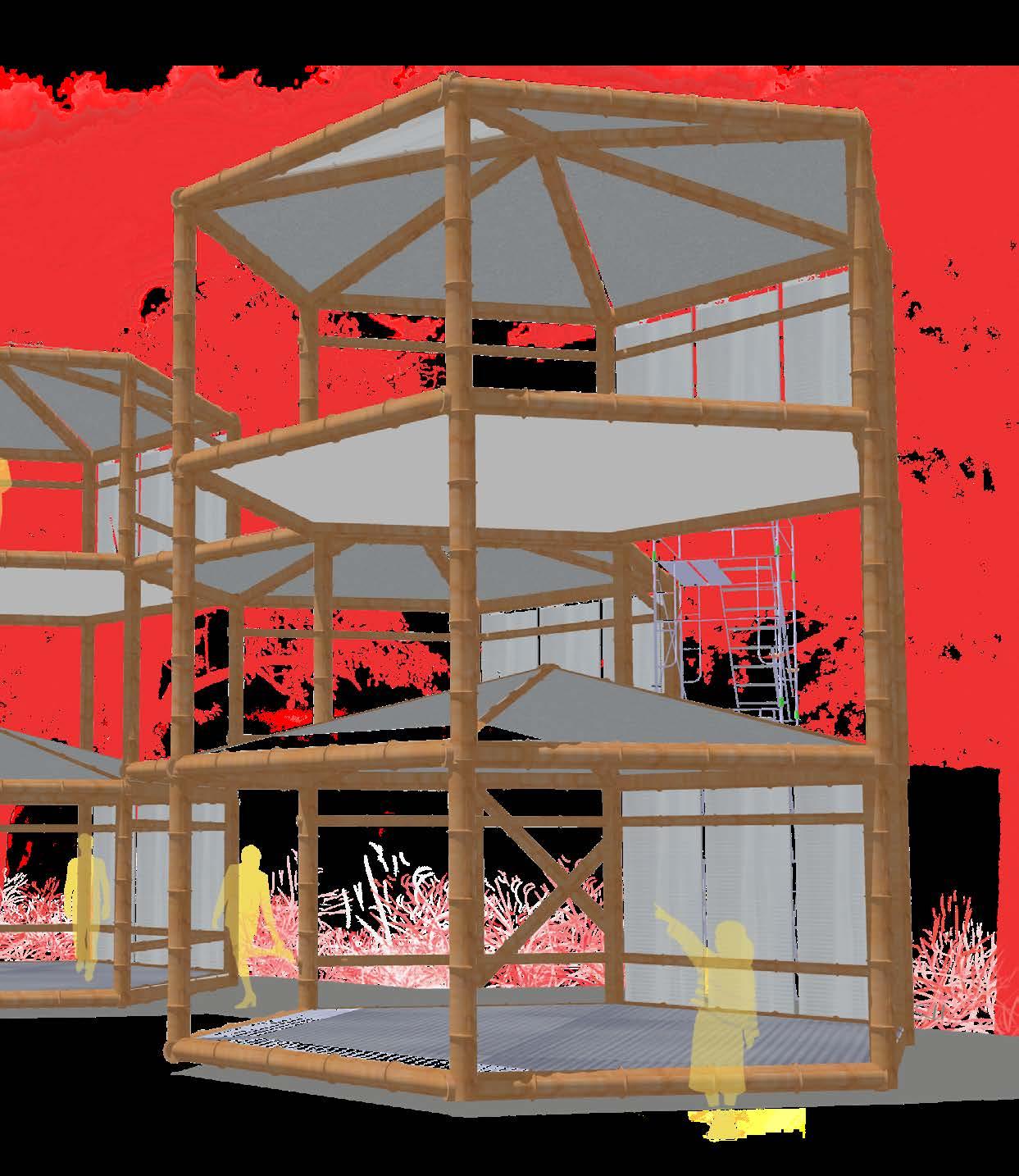 The illustration shows how the circulation of audience flows when they enter Hexa cells. The roof can be accessed, and the audience can go to third level of another cells. Scaffolding stairs will be used to support the vertical circulation.