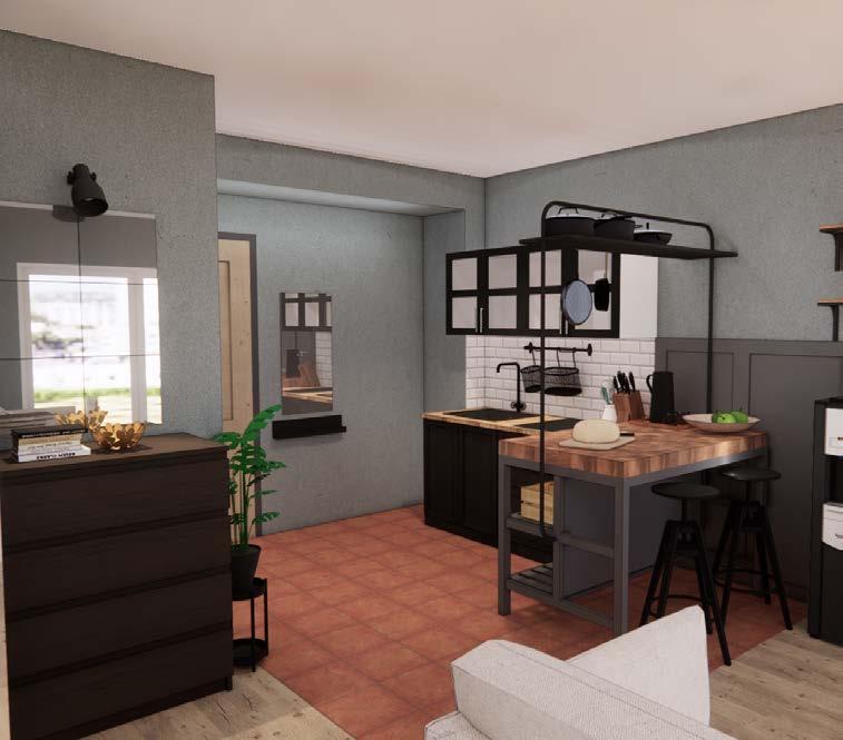 The main idea is to create a traditional interior looks, combined with a masculine style. The main feature is the use of terracotta tiles in the kitchen as a subtle divider that leads to the living area.