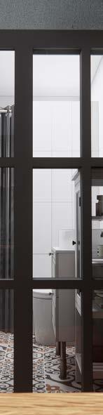 Mixed tiles in bathroom, combined with black-steel frame glass door, is also the element added to create traditional looks for the apartment.