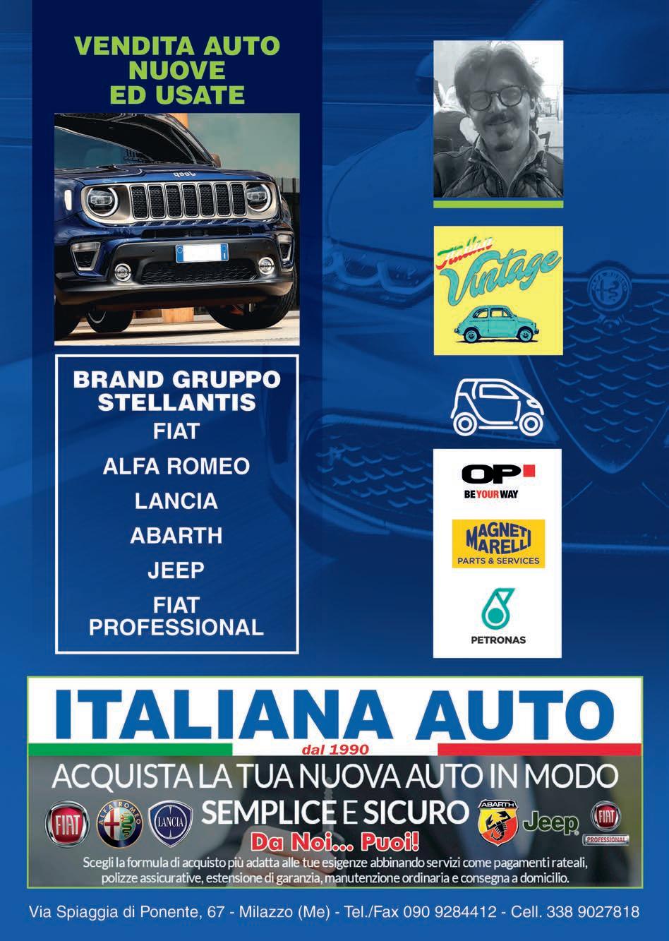 VIVI CITTÀ MILAZZO Carnet dell’ospite non si assume nessuna responsabilità per l’uso di marchi, immagini e slogan forniti da inserzionisti. Declina ogni responsabilità per eventuali errori, omissioni, sostituzioni, refusi e/o modificazioni in relazione ai dati contenuti nella presente guida, per le variazioni sulla rete viaria, per il materiale fornito da enti. Le notizie e le date pubblicate rivestono carattere puramente informativo. La responsabilità per eventuali spostamenti, errori o mancate effettuazioni di eventi non è imputabile all’azienda. Testi storici forniti da: Servizio Turistico Regionale 13 Milazzo. Ulteriori testi: VIVI CITTÀ MILAZZO Carnet dell’ospite. Spazi promo realizzati da: VIVI CITTÀ MILAZZO Carnet dell’ospite. Grafica, stampa, foto e cartina/stradario: Tipografia Lombardo.