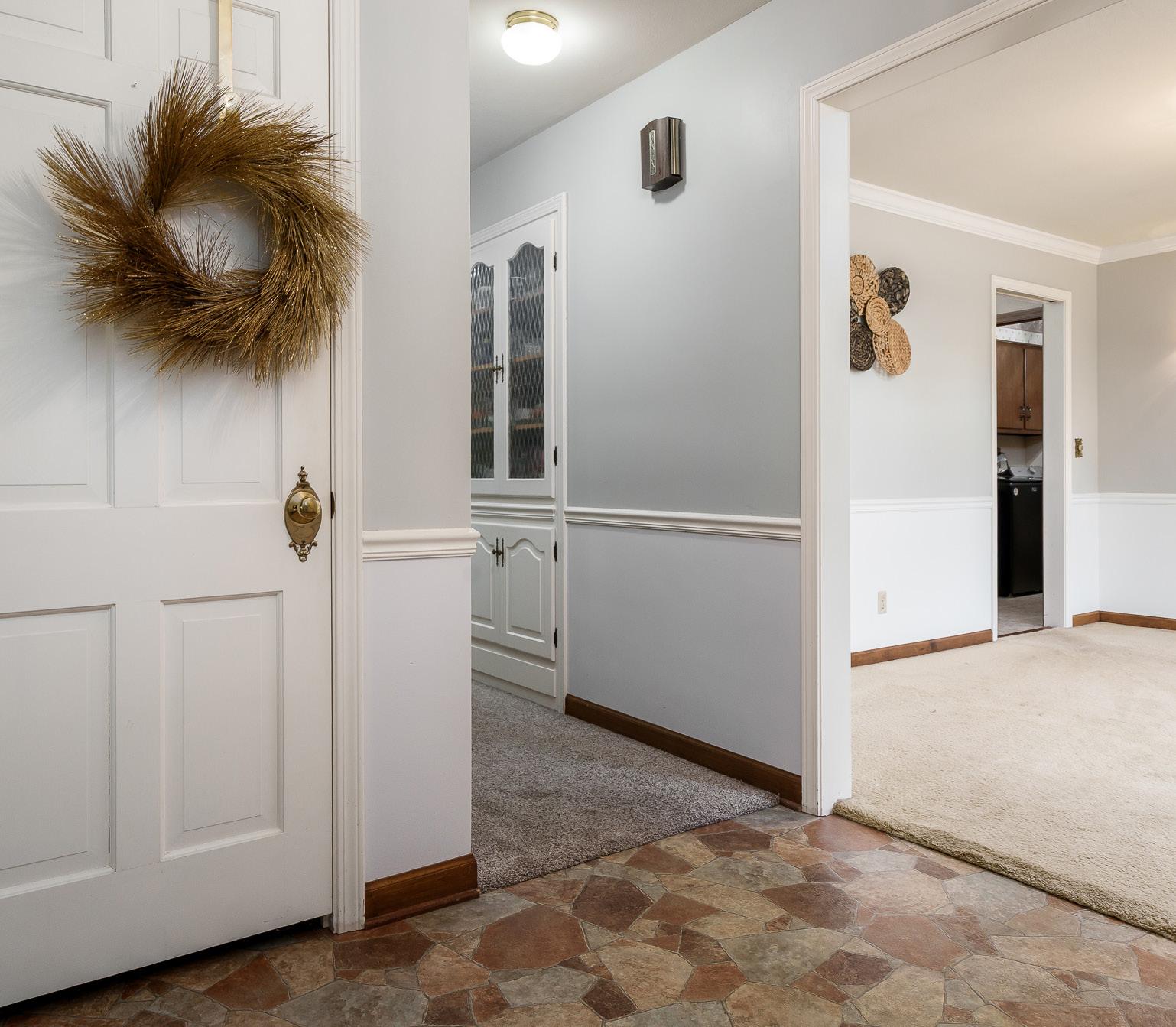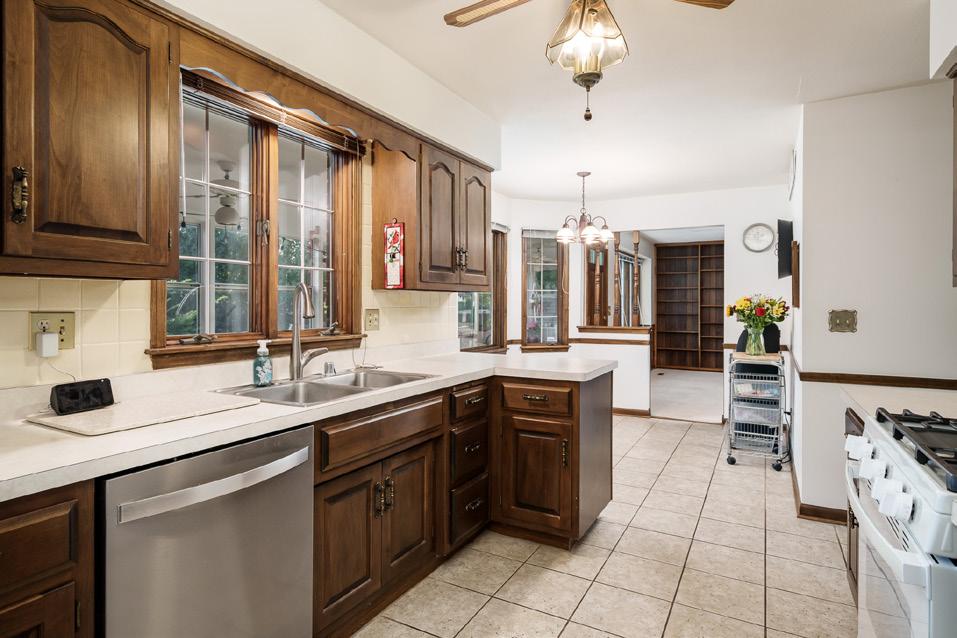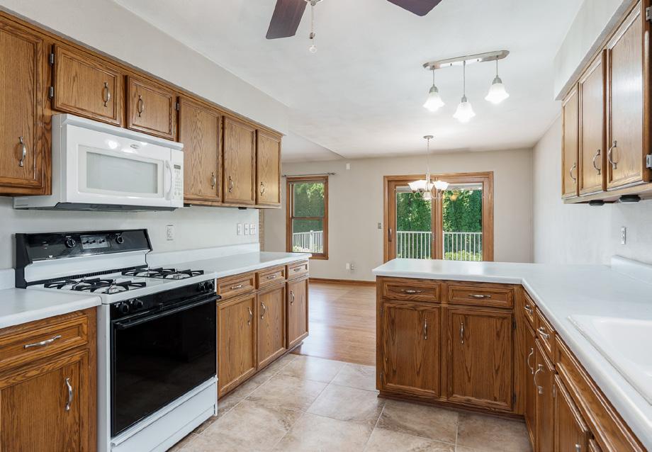 Loved by the same family for nearly 40 years. Tiled entry with coat closet, carpeted living room with oak flooring running through the bedrooms, hall, dining, and kitchen. Nice oak laminate in the den. Bright tiled bath. Vinyl replacement windows. Storage space galore. A huge amount of kitchen counter space with solid oak cabinets, and a pantry with slide-out shelves. Versatile room off the garage has corner windows and can offer options such as home office, den, main floor laundry, etc. The basement has a spacious rec room, a hobby room, a guest room with a closet, and a large utility room . The spacious deck leads to a shady backyard with a brick path. (Some photos are virtually staged.)