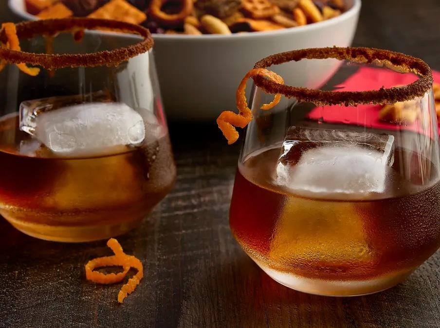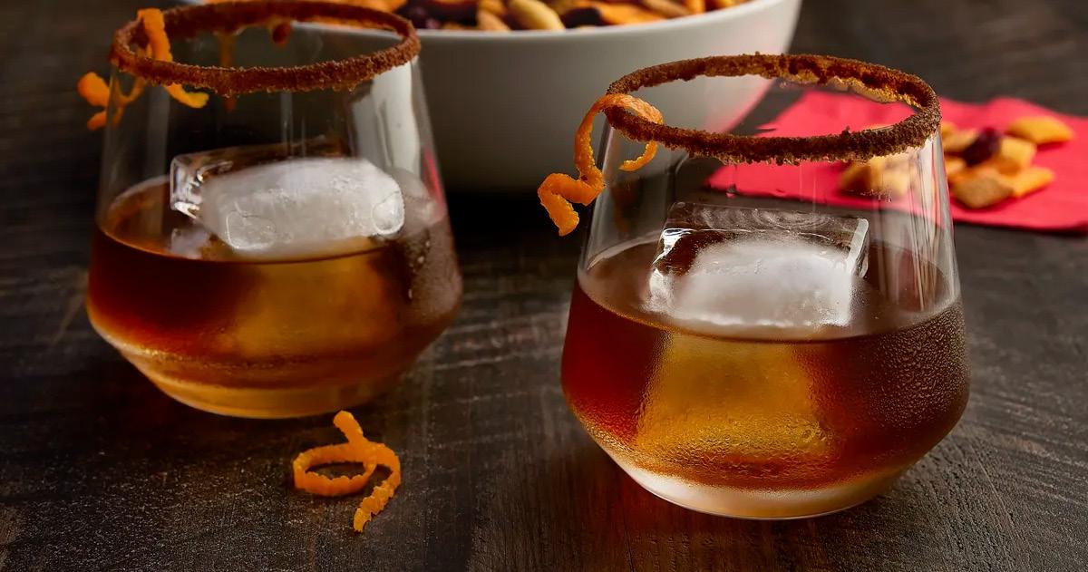 To make Old Fashioned, place the pumpkin spice sugar on a small plate. Wet the rim of a 10-oz old-fashioned glass. Dip the rim of the glass into the spice mixture. Fill glass with ice. Add bourbon, caramelized simple syrup and bitters; stir. Garnish with orange twist or slice.