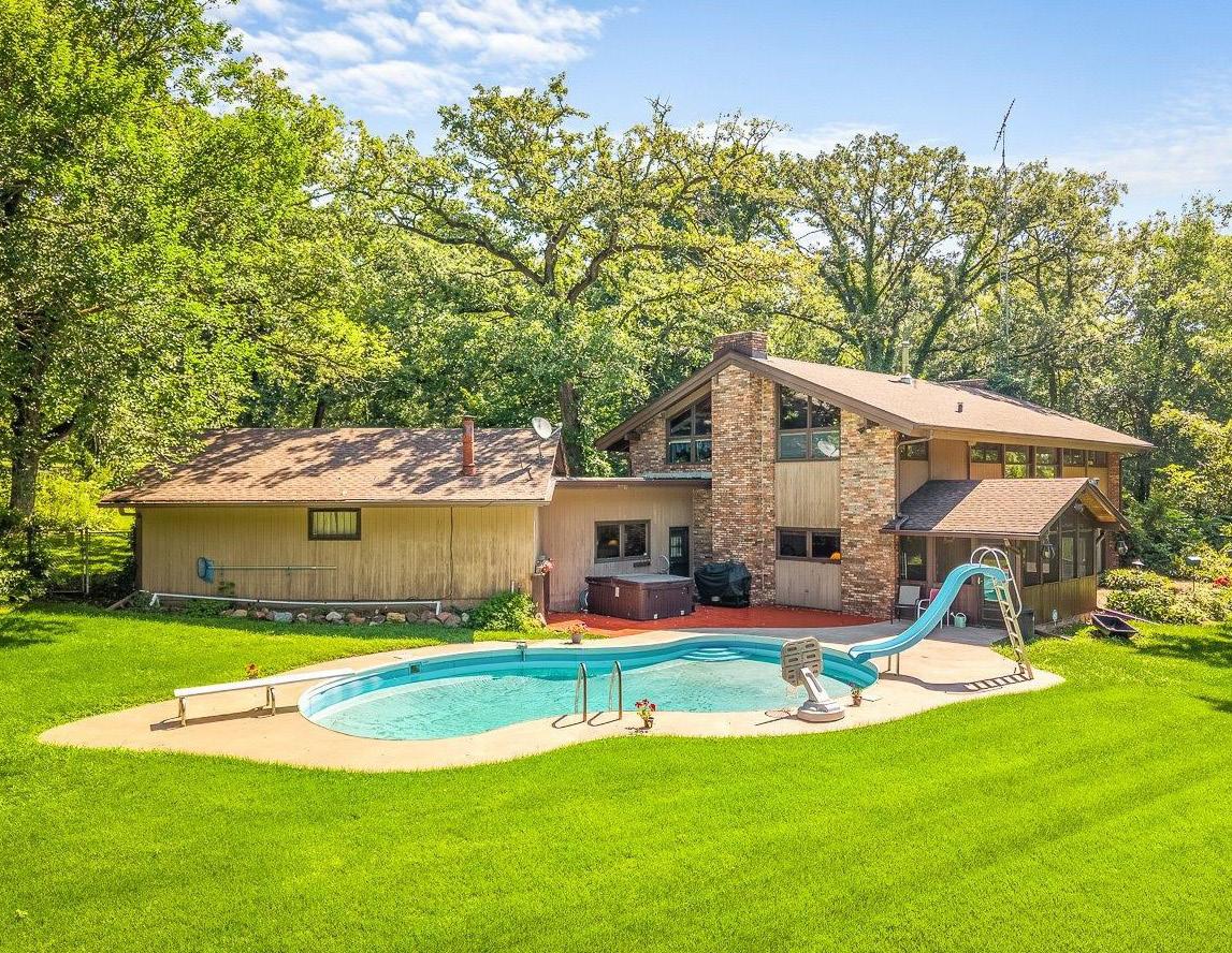 Spectacular mid-century contemporary home on a stunning one(+) acre wooded lot with an inground pool, hot tub, and spa— your private resort! Nestled at the end of a cul-de-sac, this multilevel home backs to the 636-acre Seward Bluffs Forest Preserve for unmatched privacy, views, and year-round natural beauty. Large windows throughout fill the home with light and frame breathtaking scenery. Dramatic open-beam ceilings are featured throughout most of the house. The open floor plan boasts three fireplaces, two sky windows, a spacious kitchen with breakfast bar, a family room with pegged oak floors, and an amazing three-season room with a cathedral ceiling. The primary suite features a cathedral ceiling, brick fireplace, and cozy sitting area. Located in desirable Pecatonica schools with easy access to I-90/39/ US 20. Truly a rare retreat! 4 BD | 2/1 BA | 3,016 SQ FT