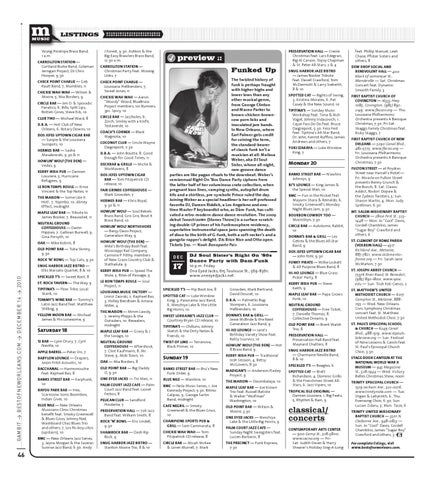PreServation hall — Creole Christmas feat. Lars Edegran, Big Al Carson, Topsy Chapman & St. Peter All-Stars, 2 & 4 Snug harBor Jazz BiStro — James Booker Tribute feat. Davell Crawford, Tom McDermott & Larry Sieberth, 8 & 10