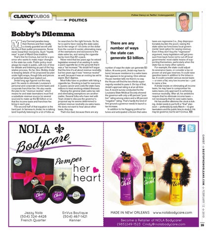 Bobby’s Dilemma any Carnival parades keep their themes and their royalty a closely guarded secret until the day of their public processions. some never reveal their monarchs. such “mystikness” is part of Mardi Gras tradition. That’s fine for Comus, but not for a governor who wants to make major changes in the state tax code. Public policy must always be made in public, with lots of time for debate and tinkering as part of the legislative process. so far, Gov. Bobby Jindal is keeping details of his proposed tax plan under tight wraps, though bits and pieces of potential ideas have leaked out. Jindal long ago figured out the easy part: He wants to eliminate Louisiana’s personal and corporate income taxes and corporate franchise fee. He also wants the plan to be “revenue neutral,” which means he and state lawmakers must find a substitute revenue source (or several sources) to make up the $3 billion or so that the income taxes and franchise fee bring in each year. The second half of that equation is the hard part. In fairness to Jindal, he is talking (and hopefully listening) to a lot of folks as