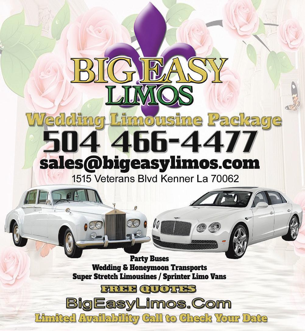 Forawedding,chooseBig Easy Limos, Arrive in style, like high-class heroes.Their serviceisgrand,The best in theland, Theirfleetisa sight to behold-o!