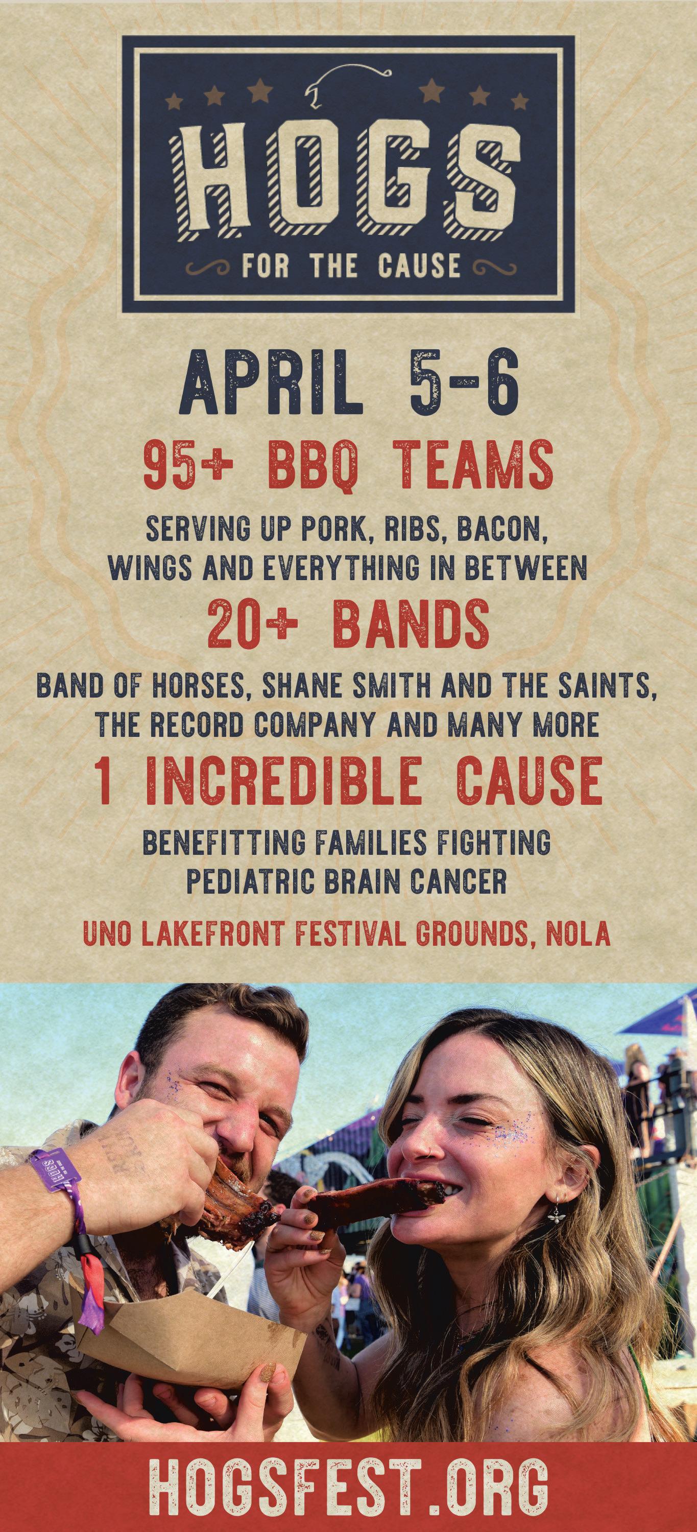Band of Horses, Shane Smith & the Saints and The Record Company headline the two-day music and barbecue festival that raises funds to battle pediatric brain cancer. roughly 90 barbecue teams compete for awards for best whole hog, ribs, pork butt/ shoulder, sauce and creative categories for side dishes and more (see 3-course interview, page 20). Teams also offer a wide array of creative dishes to attendees. The music line-up is heavy on Americana and also includes Daniel Donato’s Cosmic Country, Tanner Usrey, Eggy, The Mountain Grass Unit, Drayton Farley, Briscoe, Cole Chaney and more. In 16 years, the festival has raised more than $11 million for the cause. The festival is on the grounds outside the UNO lakefront Arena on Friday, April 5, and Saturday, April 6. Tickets and information are available at hogsfest.org.