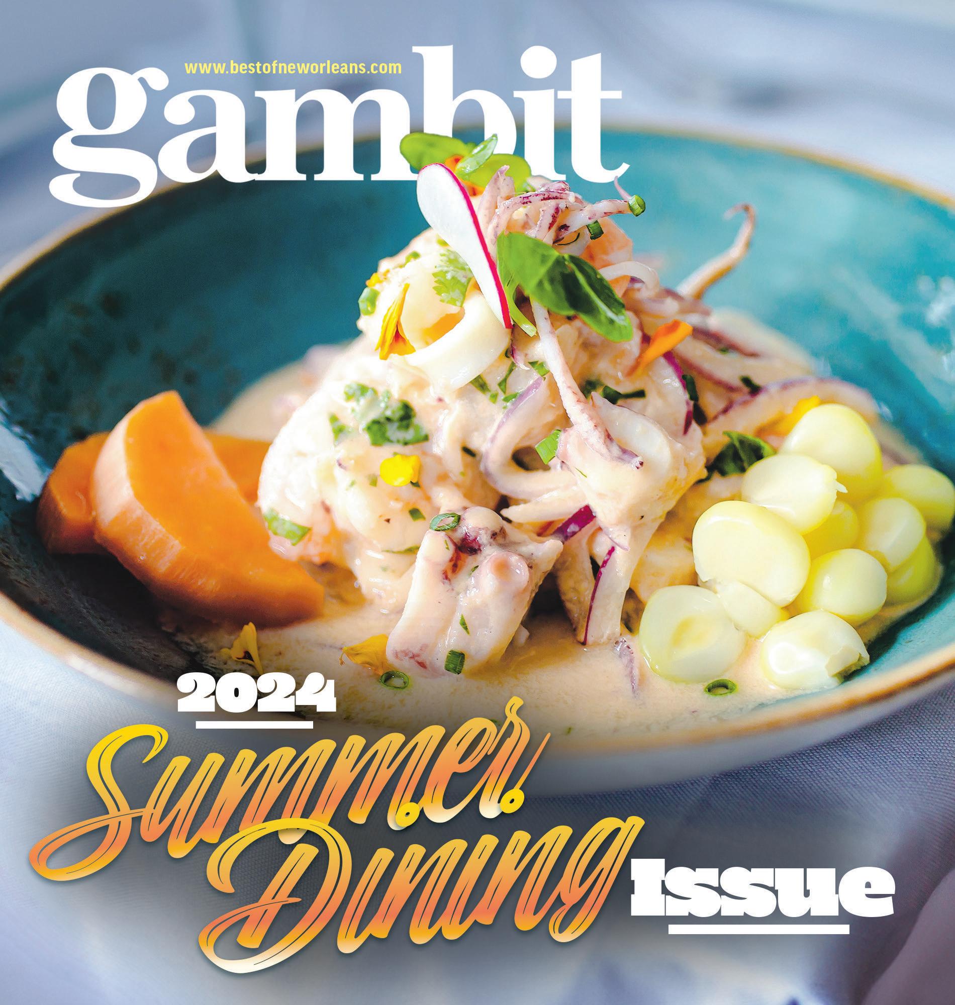 4 GA MB IT > BE ST OF NE WO RL EA NS .C OM >M Ay 20 -2 6>2 02 4 MAY20— MAY26, 2024 VOLUME 45 || NUMBER 21 COVERPHOTO BY CHRISGRANGER / THETIMES-PICAYUNE COVERDESIGNBYDORASISON NEWS OpeningGambit. 7 Commentary ..................11 ClancyDuBos.................13 BlakePontchartrain..........15 FEATURES Arts&Entertainment........5 MusicListings.................45 Music............................47 GreekFestPreview.........48 Puzzles..........................51 CONTENTS GAMBIT(ISSN1089-3520)ISPUBLISHEDWEEKLYBYCAPITALCITYPRESS, LLC,840ST.CHARLESAVE.,NEWORLEANS,LA70130.(504)486-5900 WECANNOTBEHELDRESPONSIBLEFORTHERETURNOFUNSOLICITED MANUSCRIPTSEVENIFACCOMPANIEDBYASASE.ALLMATERIAL PUBLISHEDINGAMBITISCOPYRIGHTED:COPYRIGHT2024CAPITALCITYPRESS,LLC.ALLRIGHTSRESERVED