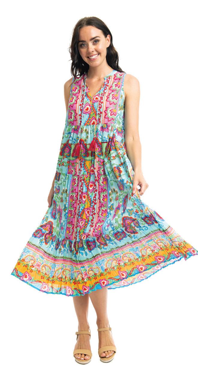 From the start, Katie has partnered with Indian tailors to produce ethical, breathable, and stylish clothing made from organic fabrics and eco-friendly dyes. The brand uses traditional methods like block printing and ikat (a laborious technique that involves resist-dyeing yarns before they are woven). These processes take longer to complete than the average massproduced garment but result in long lasting clothes with unique prints and high-quality fabrics.