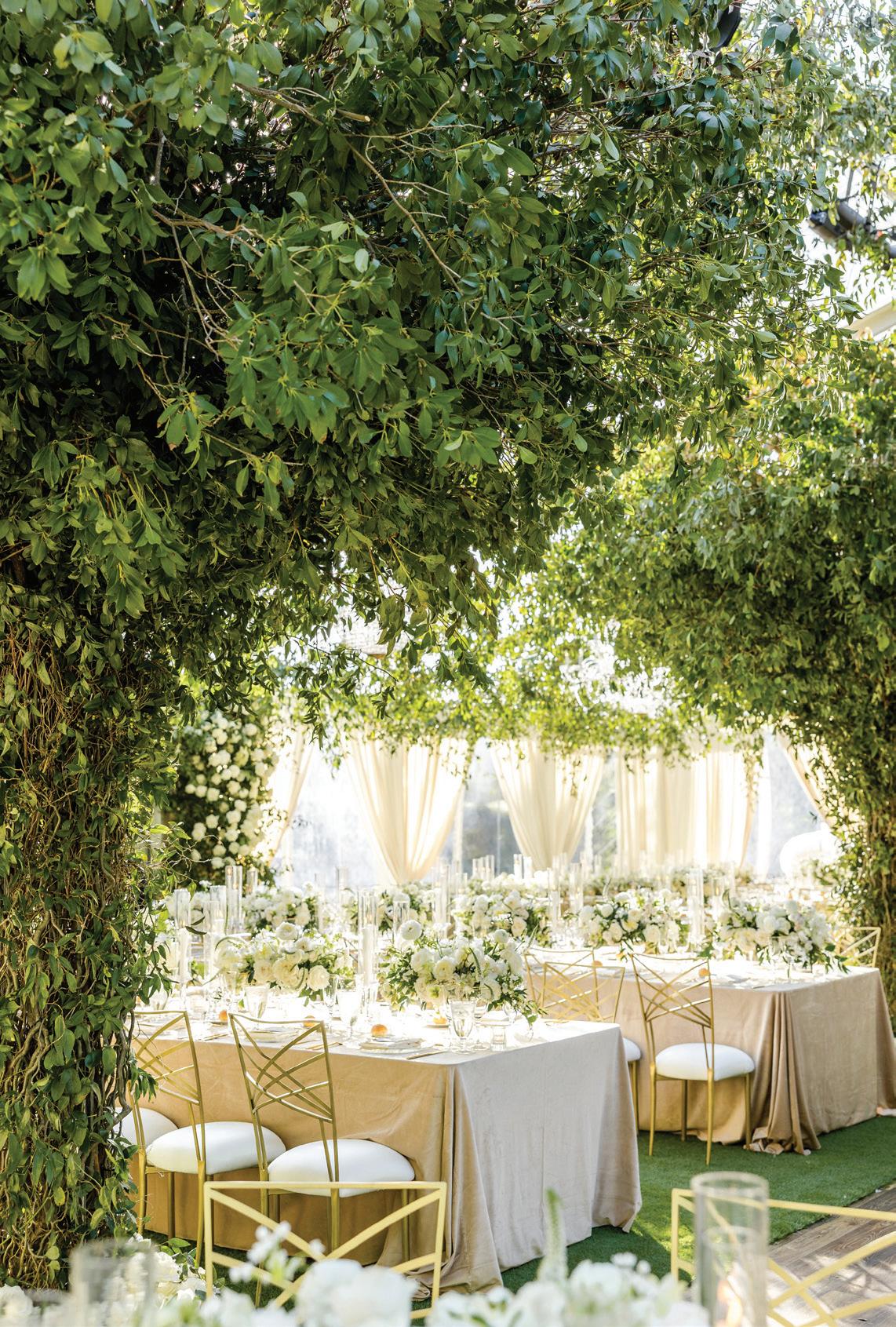 St. Louis Cathedral served as the ceremony location, accompanied by gospel music from New Orleans female group Jessica Harvey and the Difference. Sevetri’s Baptist pastor performed the sermon, and Aulston’s Catholic priest married the couple. As they exited the cathedral, the St. Augustine Marching 100 greeted their CEO and his new bride with two songs: “Running Up That Hill (A Deal with God)” by Kate Bush and “Welcome 2 tha Nolia” by Juvenile. Guests were asked to dress entirely in black to the afternoon and all-night fête which included a flower-filled tented reception in the Sydney and Walda Besthoff Sculpture Garden.“Elegant and classic was our wedding vibe, and our guests embraced it,” the couple says.