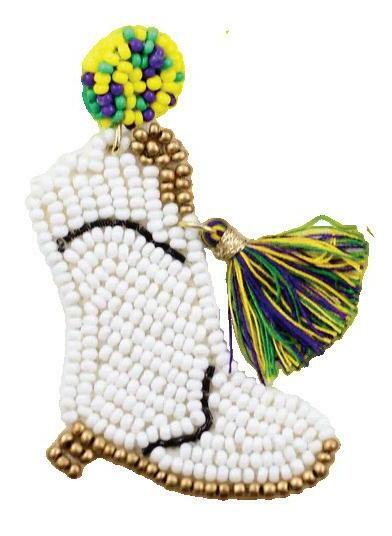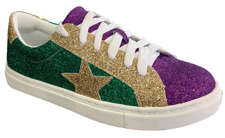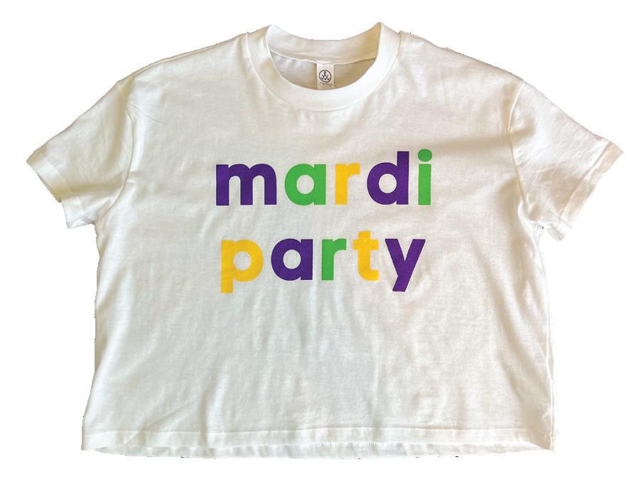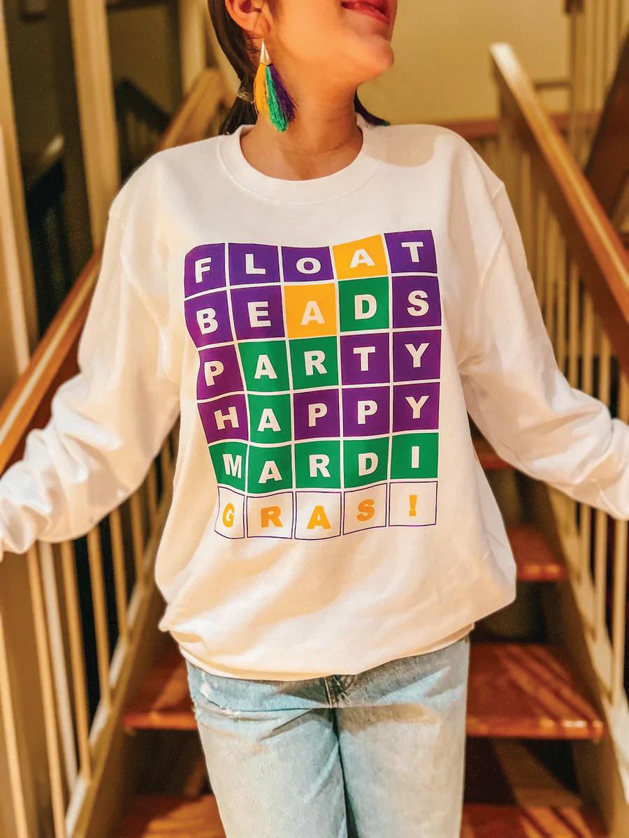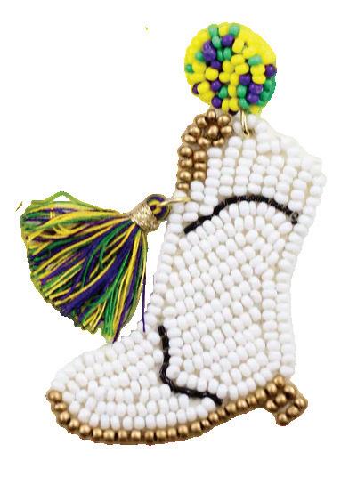 1. Whereable Art Crewneck, $56, Little Miss Muffin, shoplittlemissmuffin.com 2. Gaby & Grace Bracelets, $44 Each, Hazelnut, hazelnutneworleans.com 3. Mardi Gras Tee, $38, Pronto, shopitpronto.com 4. Majorette Boot Beaded Earrings, $15, Sparkle & Swag, sparkleandswag.com 5. Gaston Frames, $350, Art & Eyes, artandeyesneworleansla.com 6. Gold Fanny Pack, $125, Cool Your Fannies, @coolyourfannies