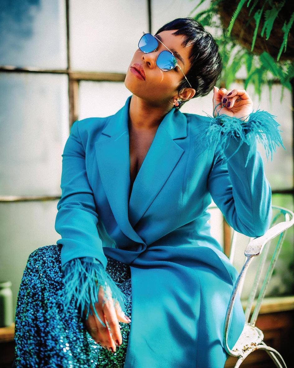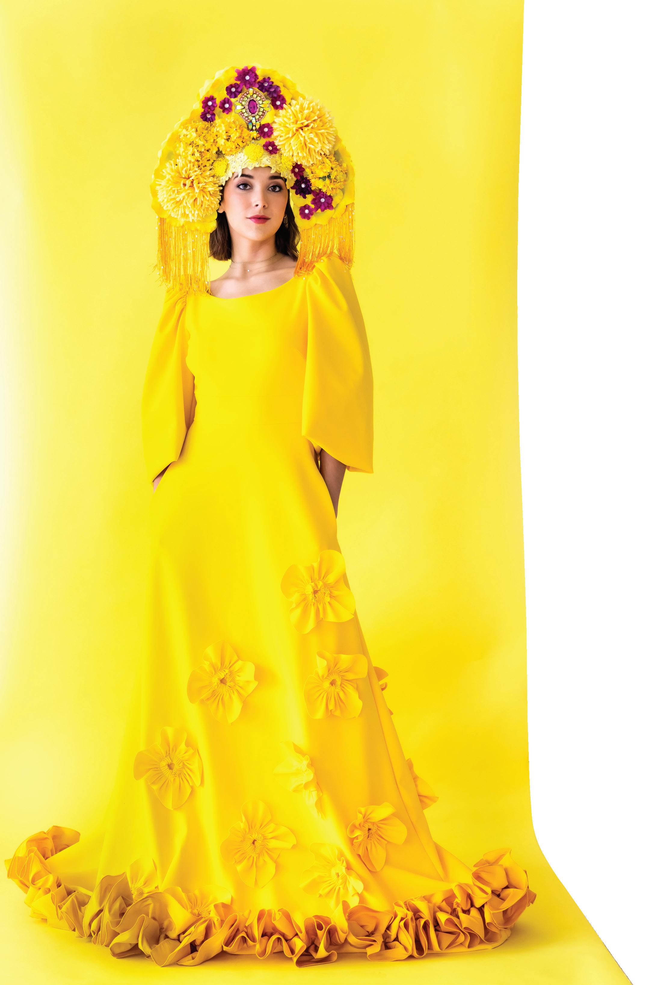 Julia wears a headdress by Kate McNee and "Alandra" by Greta Constantine ($1,645) from Sosusu