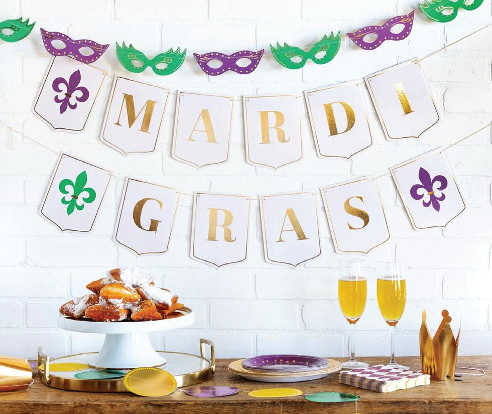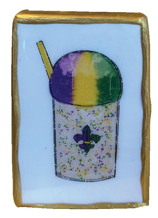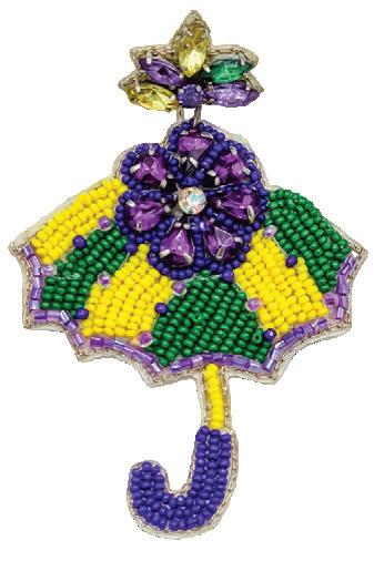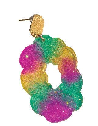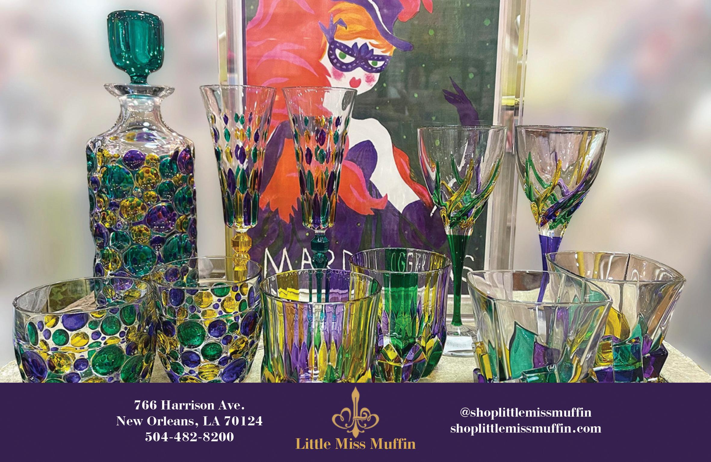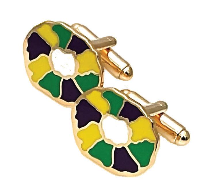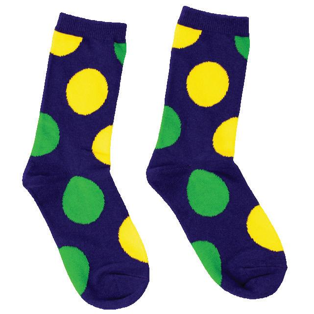 1. Polka Dot Socks, $6.95, Plush Appeal, mardigrasspot.com 2. Mario Luca Giusti Novella Glass, $25, Hilltop Shoppe, hilltopshoppe.com 3. Beaded King Cake Crossbody, $195, Hazelnut, hazelnutneworleans.com 4. Mardi Gras Banner, $12, Sparkle & Swag, sparkleandswag.com 5. King Cake Cufflinks, $46, The Shop at The Historic New Orleans Collection, shophnoc.com
