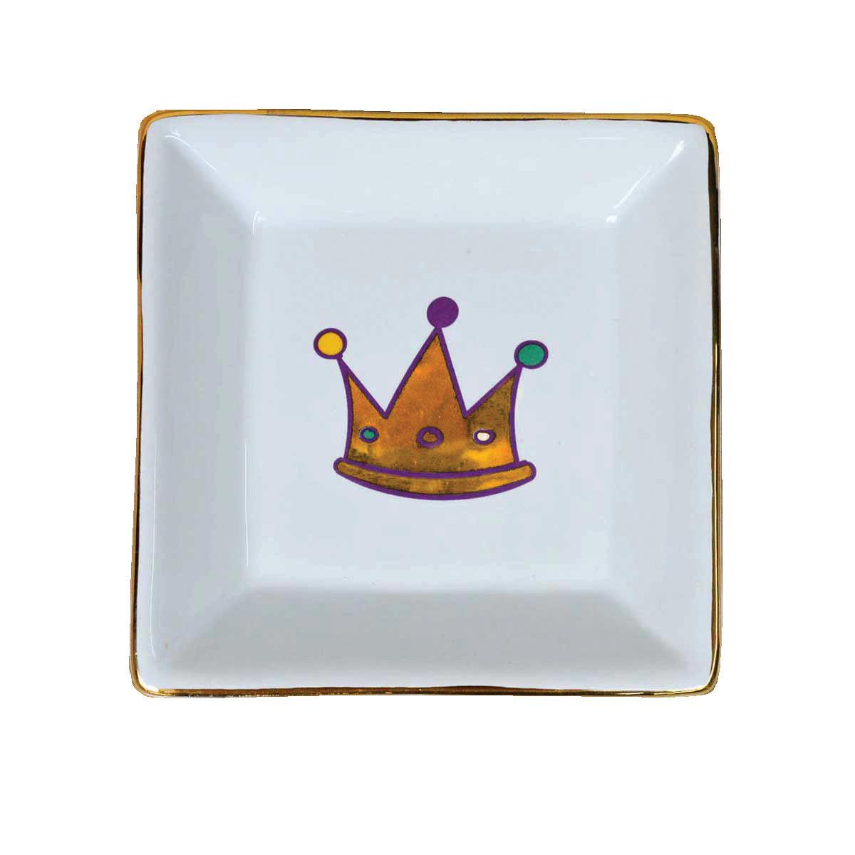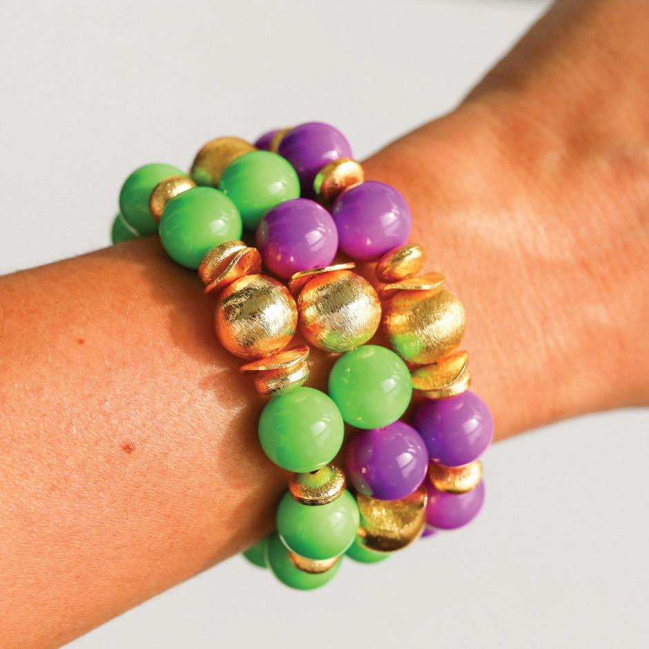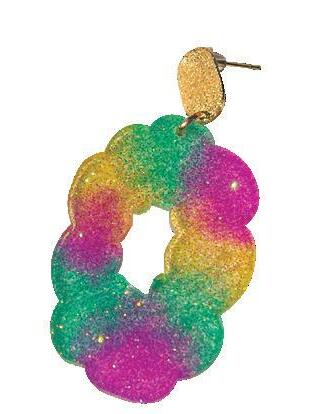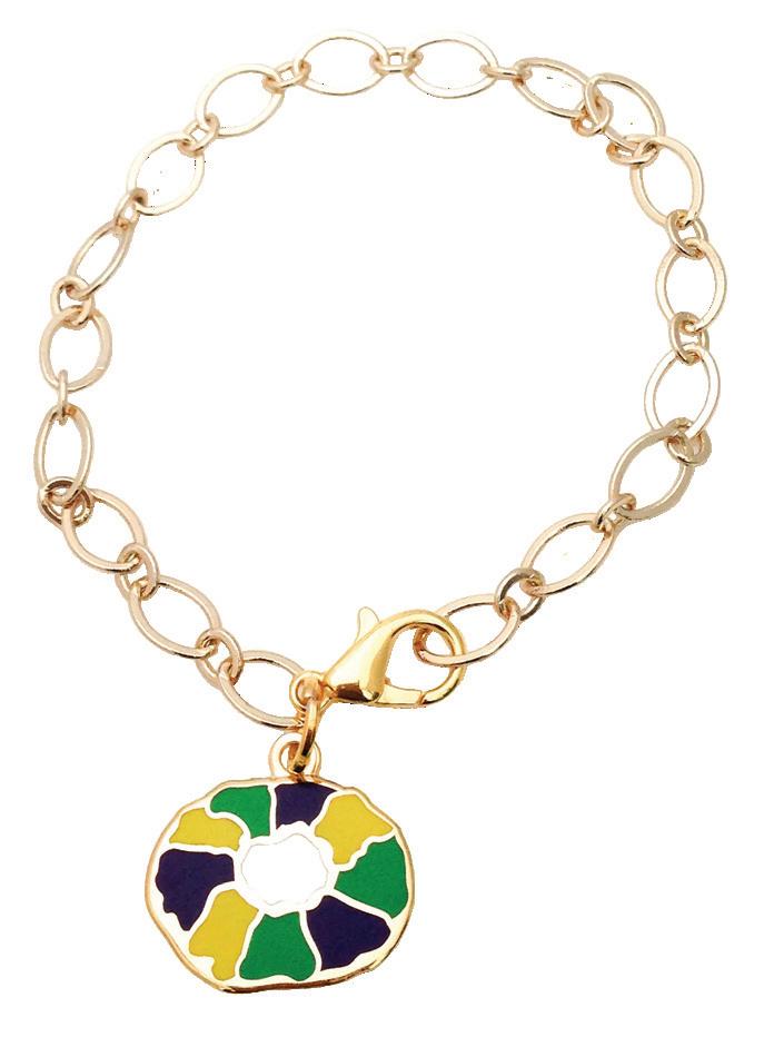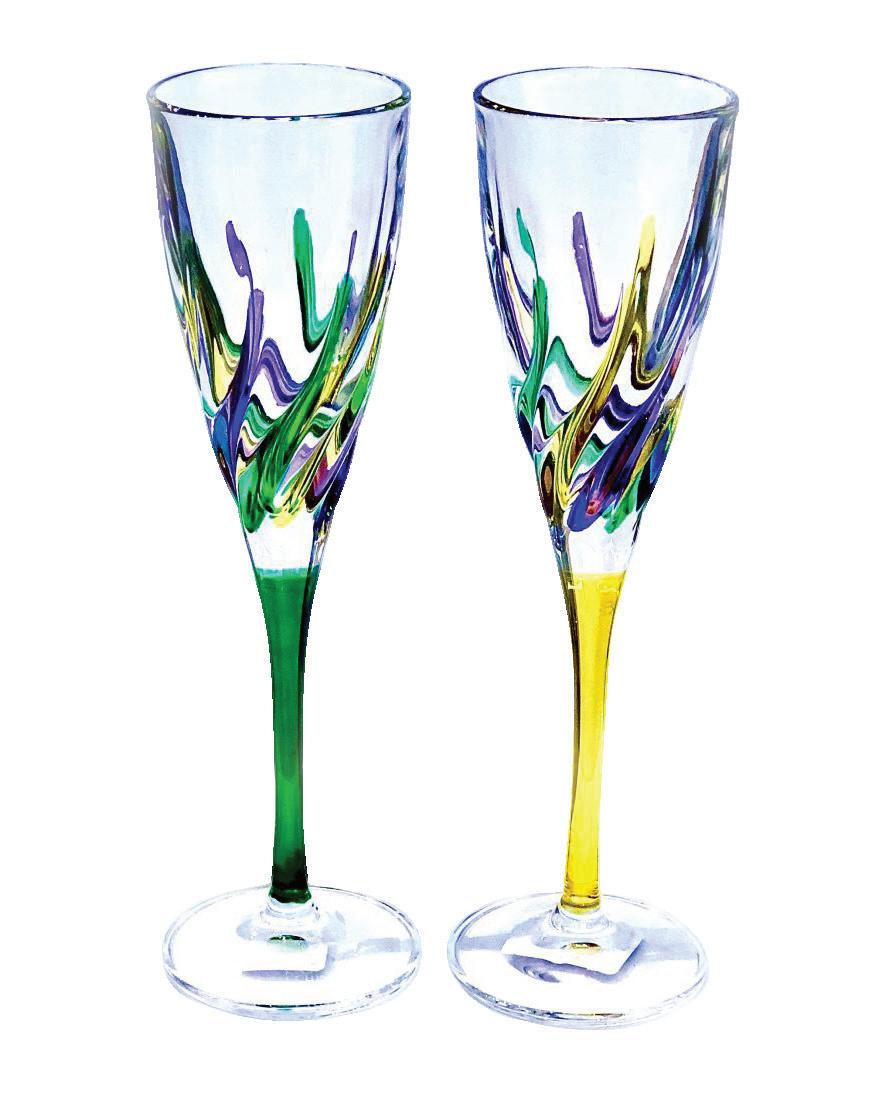 1. Polka Dot Socks, $6.95, Plush Appeal, mardigrasspot.com 2. Mario Luca Giusti Novella Glass, $25, Hilltop Shoppe, hilltopshoppe.com 3. Beaded King Cake Crossbody, $195, Hazelnut, hazelnutneworleans.com 4. Mardi Gras Banner, $12, Sparkle & Swag, sparkleandswag.com 5. King Cake Cufflinks, $46, The Shop at The Historic New Orleans Collection, shophnoc.com