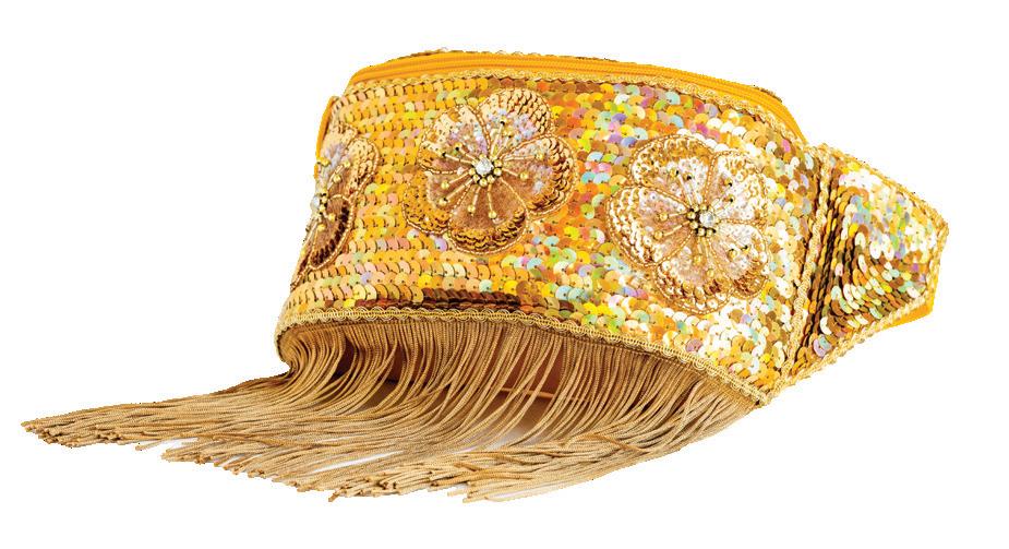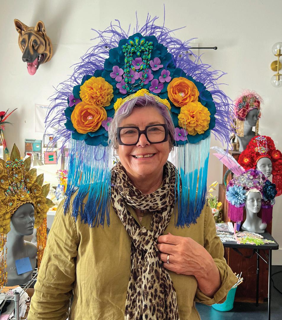 She now makes elaborate headdresses in a Cleopatra-style that covers the whole crown and ears with a dangling flap of fringe on either end. The base is a sturdy visor and McNee regularly travels to New York City’s garment district to purchase appliques like faux flowers, feathers, jewels, and more.