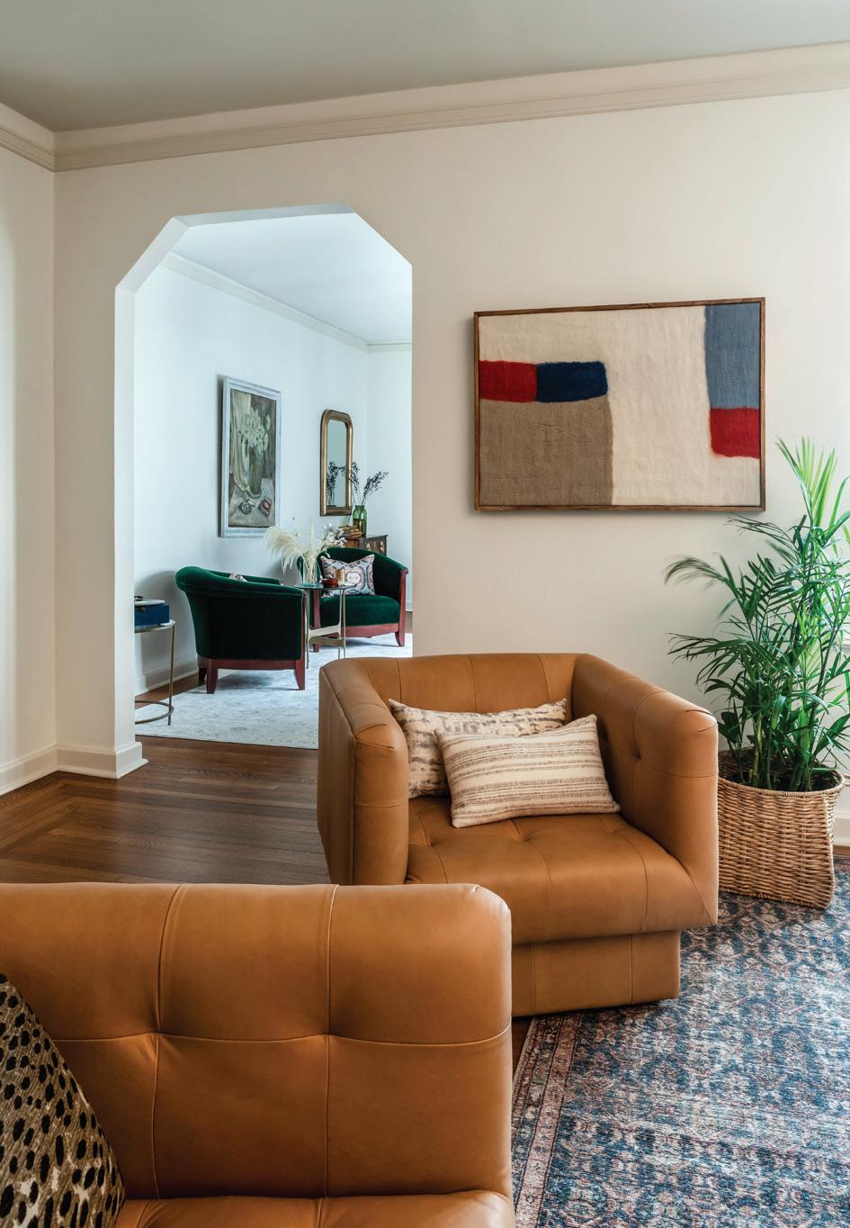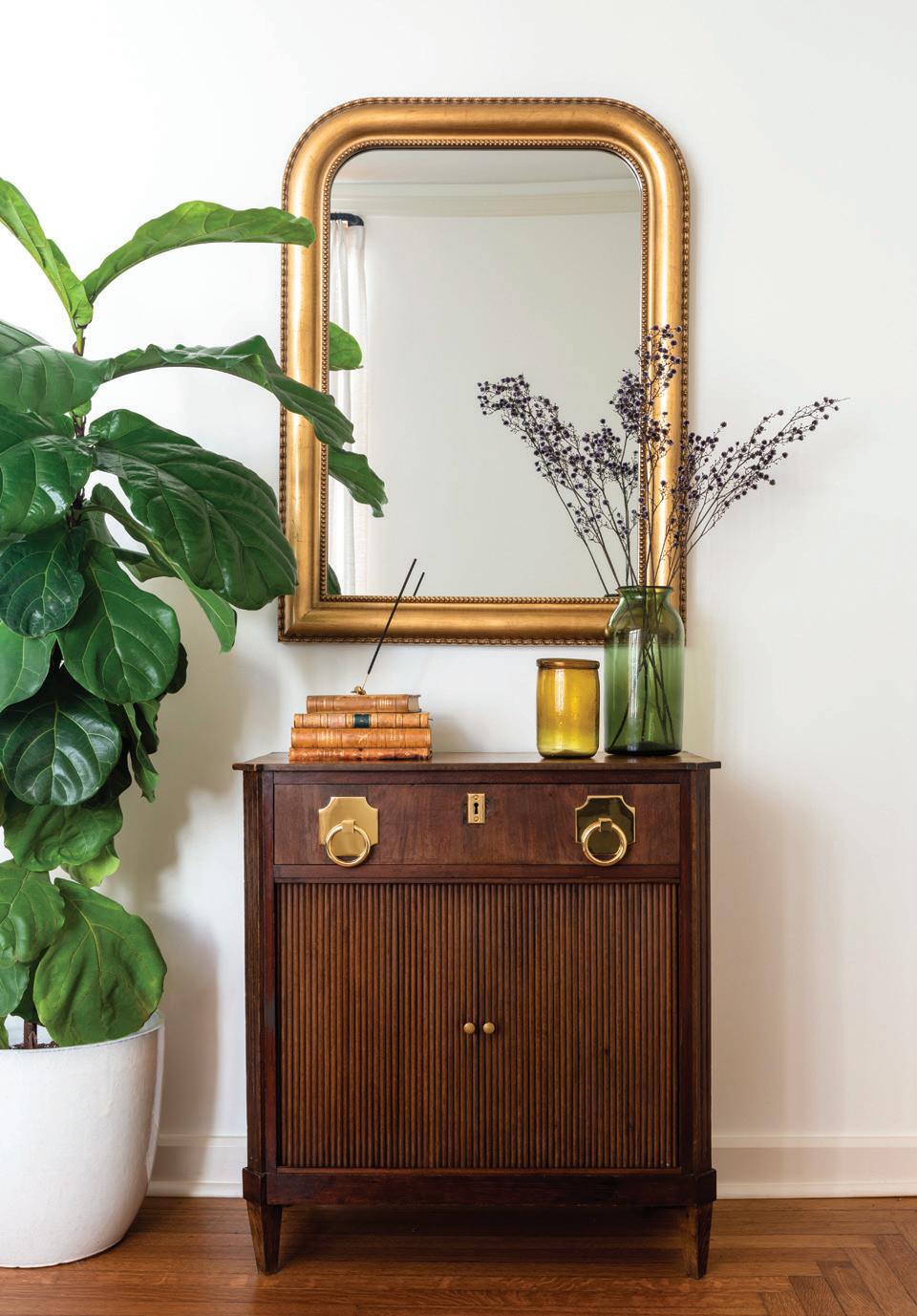 – Hattie Collins Photos by Jacqueline Marque COZY UP The CB2 couch sits under the couple’s art collection and next to the Bungalow 5 credenza. For plants, Hattie turned to Magazine Street’s FAIT for big and small varieties. The Dop Antiques table, outfitted with Modern Matter hardware, greets guests in the entryway.