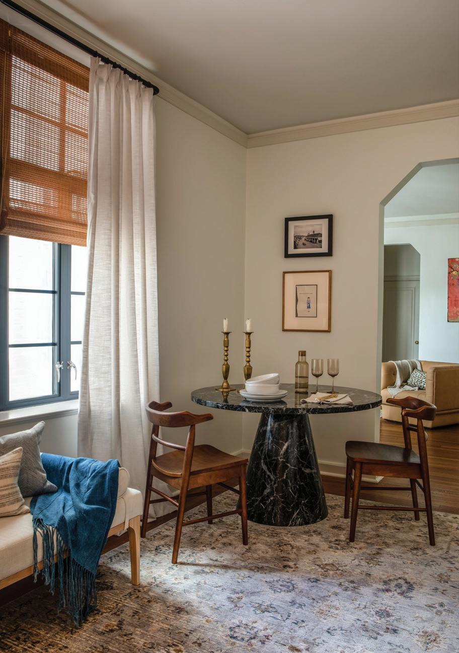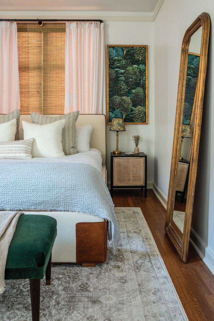 With much of the budget allocated towards more substantial pieces, the interior designer sourced from local vintage shops like Dop Antiques for the entry table and bedroom mirror alongside unexpected places like Home Depot. For window treatments, Hattie saved by pairing woven wood Roman shades with custom drapes from Amazon. She turned to Sunday Shop for cozy accents, bedding, and pillows throughout and repurposed remnants of a Cole & Son wallpaper from another project for new bedroom art. "We had them mounted onto plywood and custom framed. Now they have two beautiful panels that they can take with them when they move out!" The result is a warm and welcoming abode, ready for hosting and plenty of chefapproved meals at home.