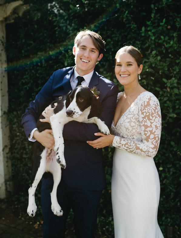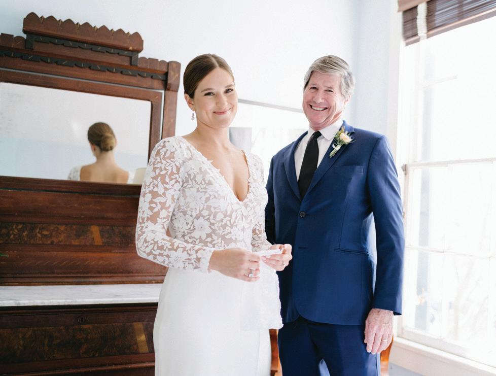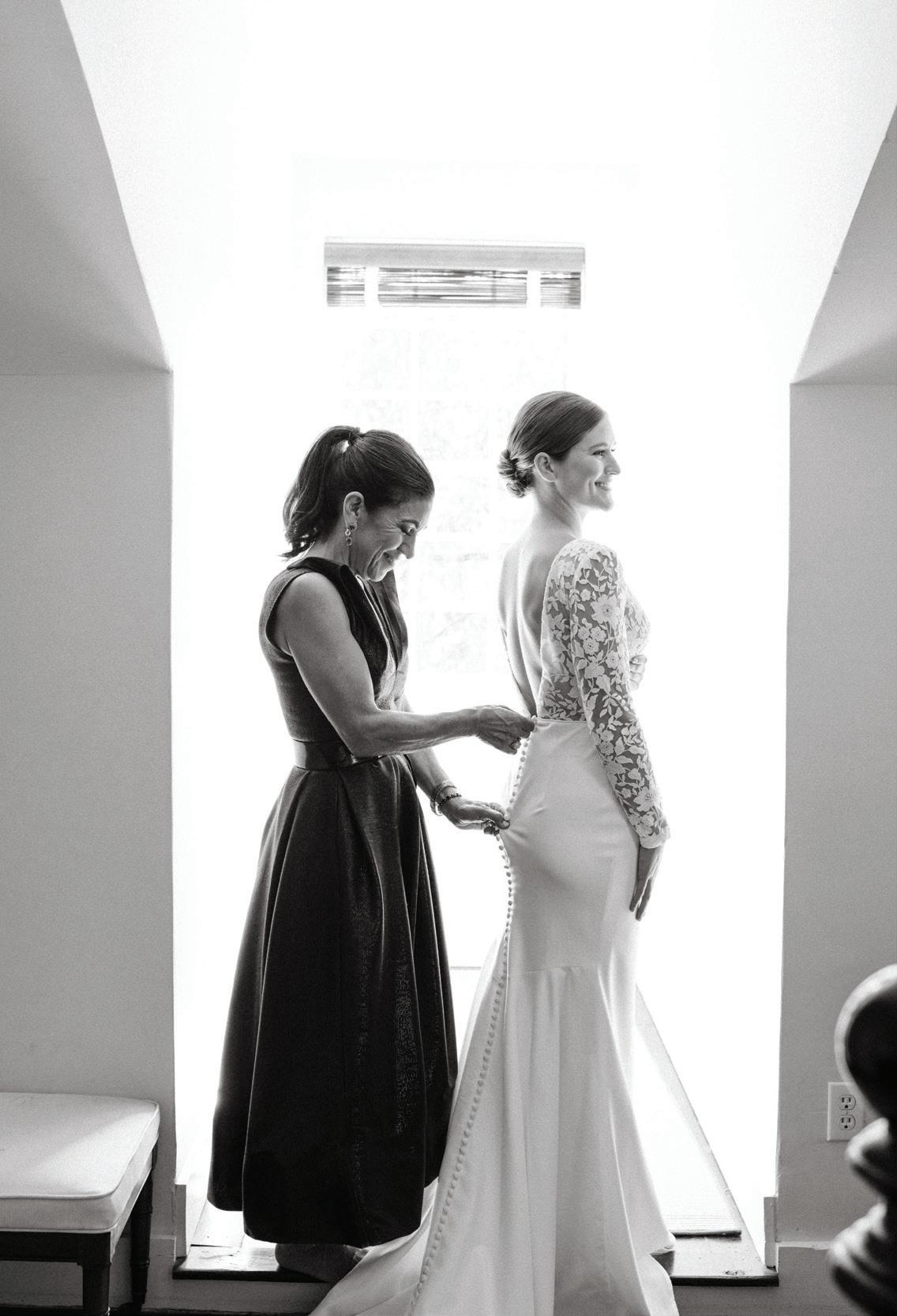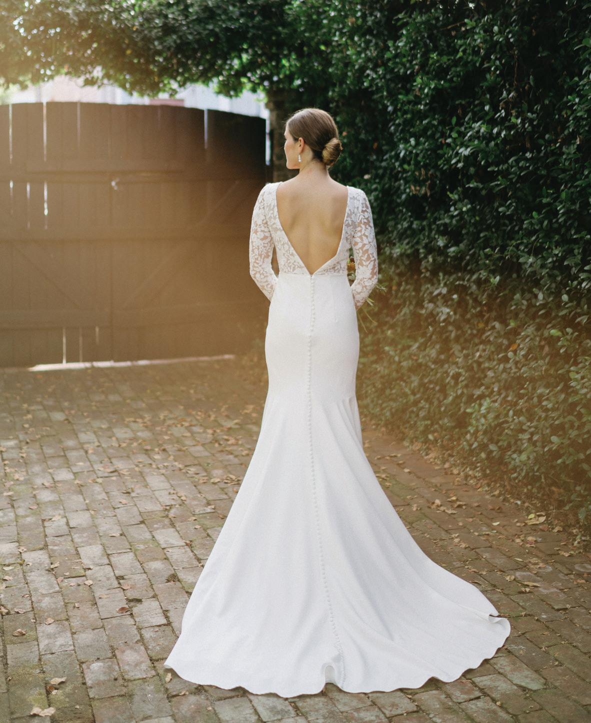 brother, she found the elegant and tailored dress she was envisioning at Jenny Yoo’s flagship. Romantic yet modern, the long-sleeved dress was originally designed with a low scoop in the back, but with the help of a tailor, Claire had it altered to mimic the front. To finish the look, she wore Mateo pearl and diamond drop earrings, handmade shoes from Greece (found via Etsy), and a blue ring gifted to her by her mom.