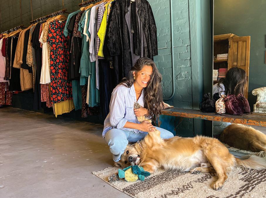 Shopping at Lekha also means visiting Archie. The pup takes his job very seriously and always looks sharp in his uniform: a single Lekha napkin folded into a bandana. "He diligently waits for me to dress him in his shop bandana before we leave the house," Trishala explains. His duties include greeting customers, guarding the doors, and occupying and entertaining