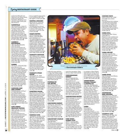 CHARLIE’S SEAFOOD 8311 Jefferson Hwy., Harahan, (504) 737-3700; www.charliesseafoodrestaurant.com Mustard- and cornmeal-fried catfish is topped with Creole sauce and served over cheddar cheese stone-ground grits. grilled fish is served with shrimp and crabmeat bordelaise. No reservations. Lunch and dinner Tue.-Sat. Credit cards. $$