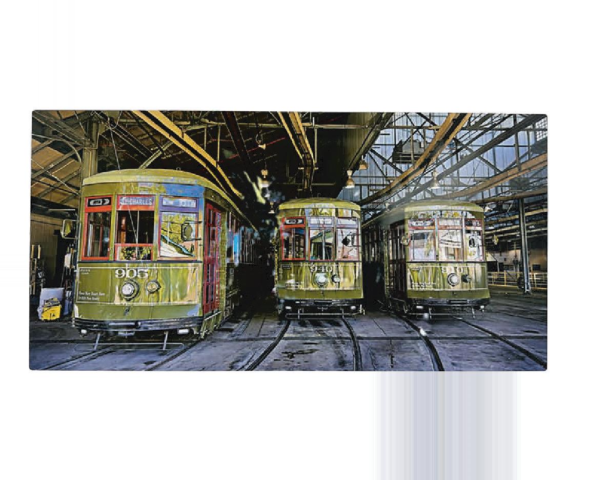 “StreetcarsinStreetcar Barn” on metal by AvivaBowman|