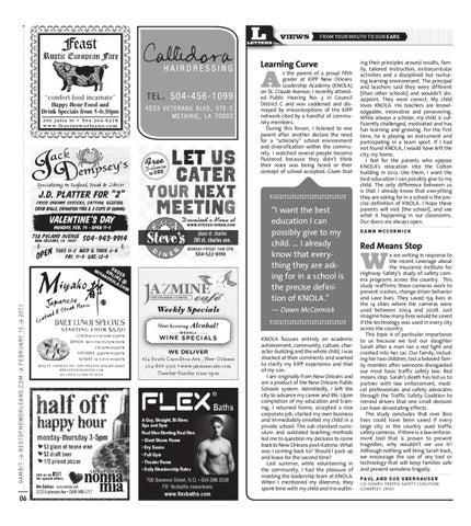 ing their principles around results, family, tailored instruction, extracurricular activities and a disciplined but nurturing learning environment. The principal and teachers said they were different [than other schools] and wouldn’t disappoint. They were correct. My child loves KNOLA. His teachers are knowledgeable, innovative and persevering. While always a scholar, my child is sufficiently challenged, motivated and has fun learning and growing. For the first time, he is playing an instrument and participating in a team sport. If I had not found KNOLA, I would have left the city, my home. I feel for the parents who oppose KNOLA’s relocation into the Colton building in 2012. Like them, I want the best education I can possibly give to my child. The only difference between us is that I already know that everything they are asking for in a school is the precise definition of KNOLA. I hope these parents will visit [the school], and see what is happening in our classrooms. Our doors are always open. D AW N M C C O R M I C K
