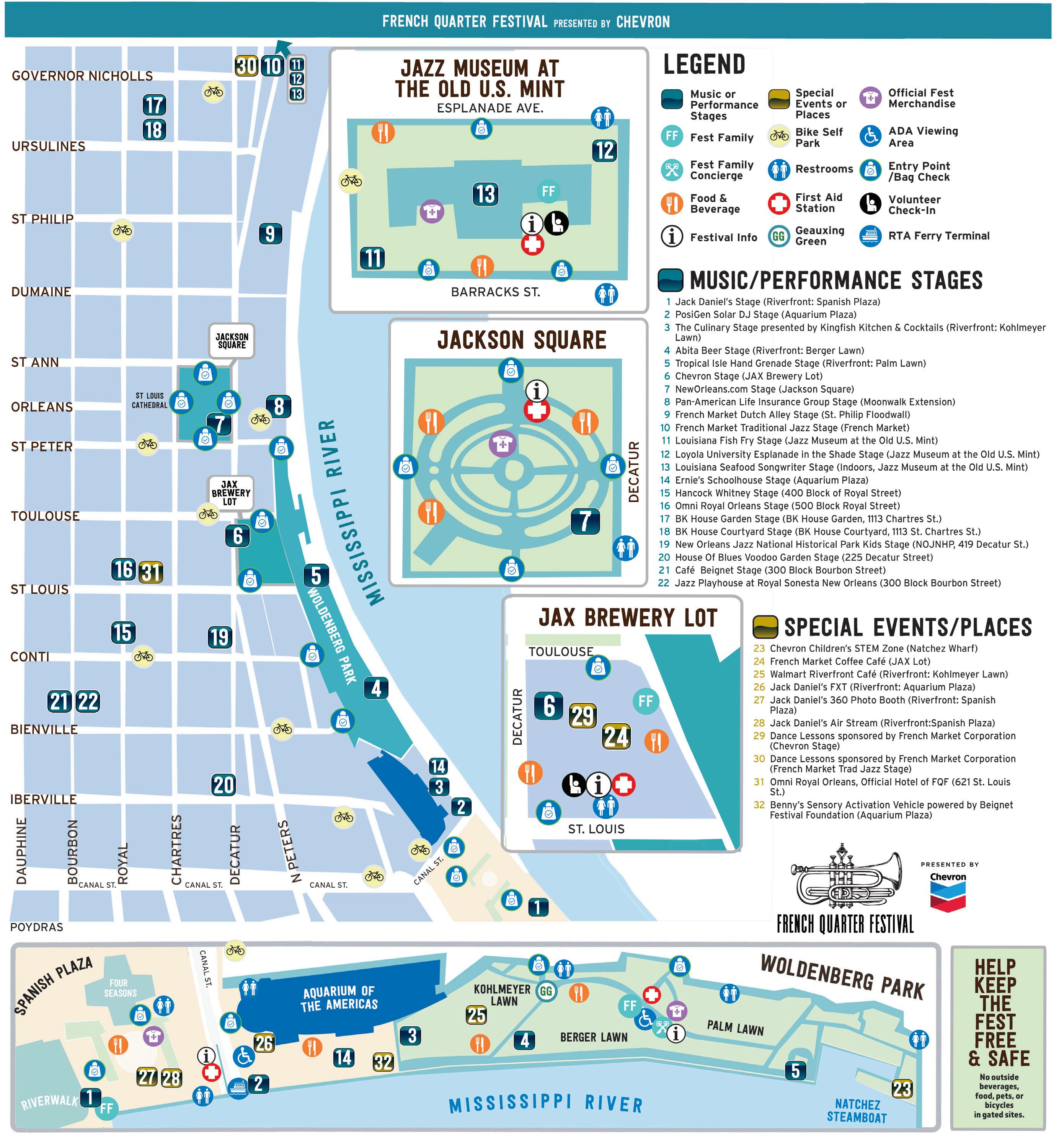 1:50 PAN-AMERICAN LIFE INSURANCE GROUP PRESENTS Marc Stone 2:10 3:25 PAN-AMERICAN LIFE INSURANCE GROUP PRESENTS Ingrid Lucia 3:45 - 5:00 PAN-AMERICAN LIFE INSURANCE GROUP PRESENTS Mia Borders 5:30 - 7:00 HANCOCK WHITNEY PRESENTS Mark Brooks 11:30 12:45 Secret Six Jazz Band 1:00 2:15 HANCOCK WHITNEY PRESENTS Secret Six Jazz Band HANCOCK WHITNEY PRESENTS The Pfister Sisters 2:30 - 3:45 HANCOCK WHITNEY PRESENTS The New Orleans Jazz Vipers 4:00 - 5:15 ONE11 HOTEL PRESENTS Shake ‘Em Up Jazz Band 11:15 12:30 LOUISE H. MOFFETT FAMILY FOUNDATION PRESENTS John Rankin 12:45 2:00 THE SHOTGUN SHACK KITTIES PRESENTS Gladney 2:15 - 3:30 Tiffany Pollack & Co. 3:45 5:00 11:00-11:30 Dance Lesson PRESENTED BY FRENCH MARKET CORPORATION Steve Pistorius & the Southern Syncopators 11:30 - 1:00 1:05 1:30 Dance Lesson PRESENTED BY FRENCH MARKET CORPORATION MAHOGANY JAZZ HALL PRESENTS Mahogany Hall All Stars 1:30 3:00 3:00 - 3:30 Dance Lesson PRESENTED BY FRENCH MARKET CORPORATION FRENCH MARKET CORPORATION PRESENTS Charlie & the Tropicales 3:30 - 5:00 Stephen Walker 5:30 - 7:00 Matt Lemmler’s “New Orleans in Stride” 11:30 - 12:45 Kid Merv 1:00 2:15 FRIEND OF FEST PRESENTS Carmela Rappazzo 2:30 4:00 BK HOUSE PRESENTS Hot Club of New Orleans 11:30 - 12:45 BK HOUSE PRESENTS Amber Rachelle & The Sweet Potatoes 1:00 - 2:15 BK HOUSE PRESENTS Jason Mingledorf 2:30 3:45 BK HOUSE PRESENTS Louis Ford & His New Orleans Flairs 4:00 - 5:15 BK HOUSE PRESENTS A.C.E. (Anderson, Chute, Easley) 11:15 - 12:30 BK HOUSE PRESENTS Bad Penny Pleasuremakers 12:45 - 2:00 BK HOUSE PRESENTS The Melatauns 2:15 3:30 BK HOUSE PRESENTS Washboard Chaz Blues Trio 3:45 - 5:00 THE ROYAL SONESTA NEW ORLEANS PRESENTS Richard ‘Piano’ Scott 11:00 - 1:30 THE ROYAL SONESTA NEW ORLEANS PRESENTS James Rivers Movement 2:00 - 4:30 THE ROYAL SONESTA NEW ORLEANS PRESENTS Caren Green 5:00 7:30 CAFÉ BEIGNET PRESENTS Rob Wagner Trio 11:30 2:00 CAFÉ BEIGNET PRESENTS Lynn Multer Trio 2:30 - 5:00 NEW ORLEANS JAZZ NATIONAL HISTORICAL PARK PRESENTS Little Stompers presents: Roots of New Orleans Music 11:00 - 12:00 NEW ORLEANS JAZZ NATIONAL HISTORICAL PARK PRESENTS FQF Experience w/ Spy Boy Walter 12:15 - 1:15 NEW ORLEANS JAZZ NATIONAL HISTORICAL PARK PRESENTS Creative Arts Momentum 1:30 - 2:30 NEW ORLEANS JAZZ NATIONAL HISTORICAL PARK PRESENTS Songs for Jr Rangers with Richard Scott 2:45 3:45 NEW ORLEANS JAZZ NATIONAL HISTORICAL PARK PRESENTS The Arrowhead Jazz Band 4:00 5:00 HOUSE OF BLUES PRESENTS Nina Hungerland & ESP 12:00 1:00 HOUSE OF BLUES PRESENTS Duane Bartels Band 1:30 2:30 HOUSE OF BLUES PRESENTS Troy Turner 3:00 - 4:00 HOUSE OF BLUES PRESENTS Cary Hudson 4:30 - 5:30 HOUSE OF BLUES PRESENTS Sean Riley & The Water 6:00 - 7:00 HOUSE OF BLUES PRESENTS Julien Primeaux 7:301:00 1:05 Special Dance Lesson 5:05 5:30 Dance Lesson PRESENTED BY FRENCH MARKET CORPORATION 5:00 -5:05 Special Dance Lesson FQF AFTER DARK @ DEW DROP INN HOTEL & LOUNGE PRESENTS AFROBEAT NOLA FT. DJ OJAY AND KOJO 9PM-12AM