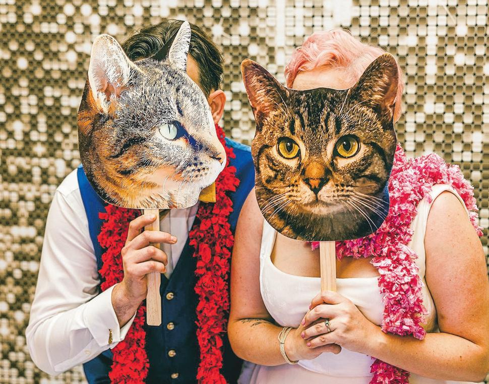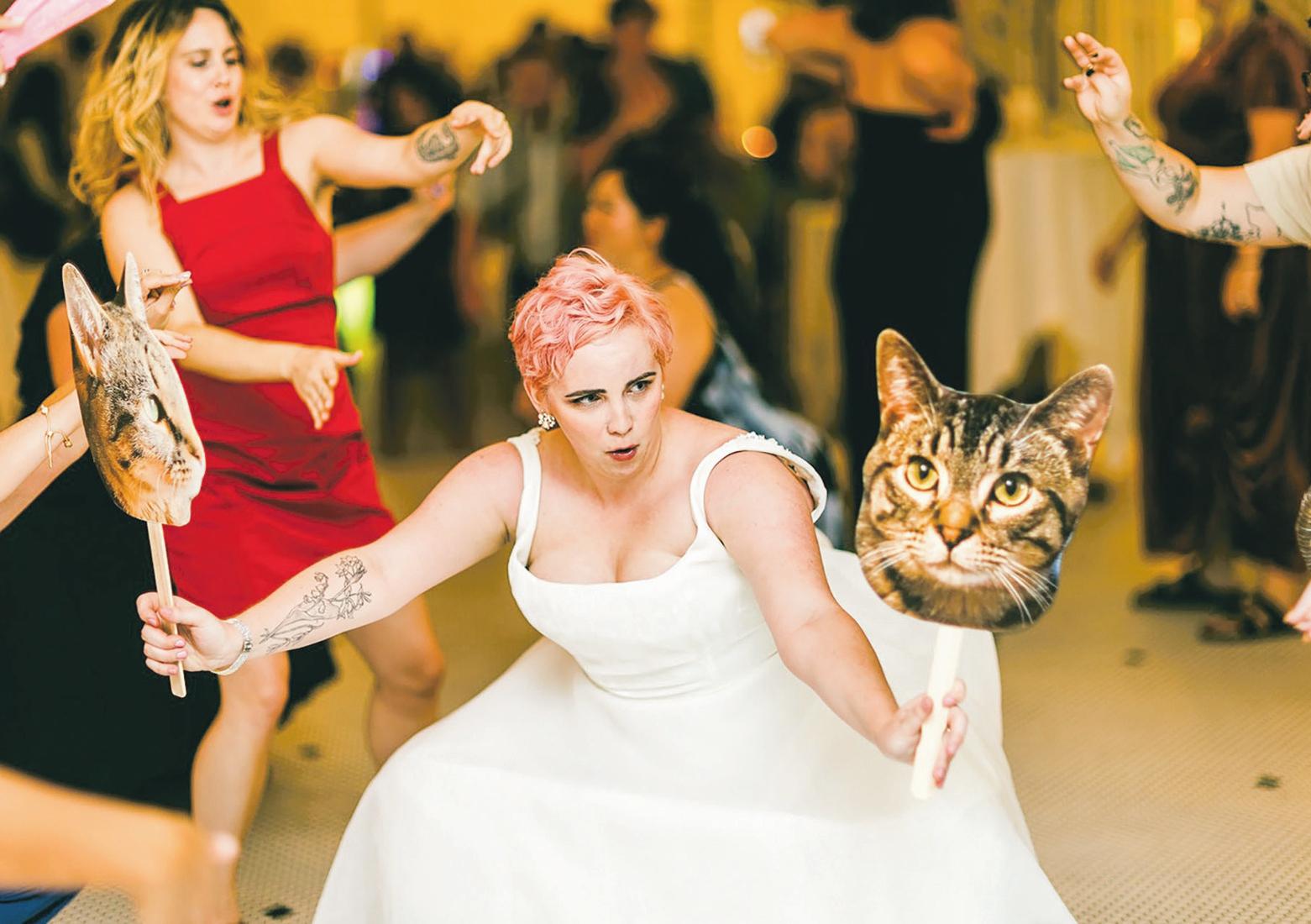 Amelia Albert dances with Fatheads of her cats at her wedding.