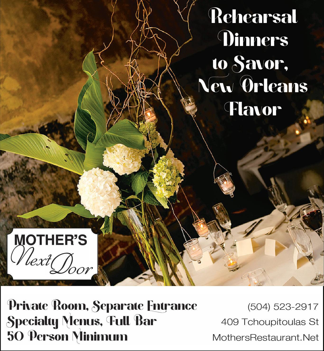 Pasta Wednesday, made with the famous ham from Mother’s and Gulf shrimp, is one of the specialty menu items exclusively served at Mother’s Next Door, the downtown restaurant’s private party room. Menu packages from casual to elaborate can be personalized; there’s a full bar, white tablecloths, and professional service. The industrial space is a blank canvas and features a separate entrance, painted walls, and exposed brick for events that are both beautiful and delicious. Rehearsal dinners and small weddings are a specialty, from 50 – 180 seated (more in a reception format).