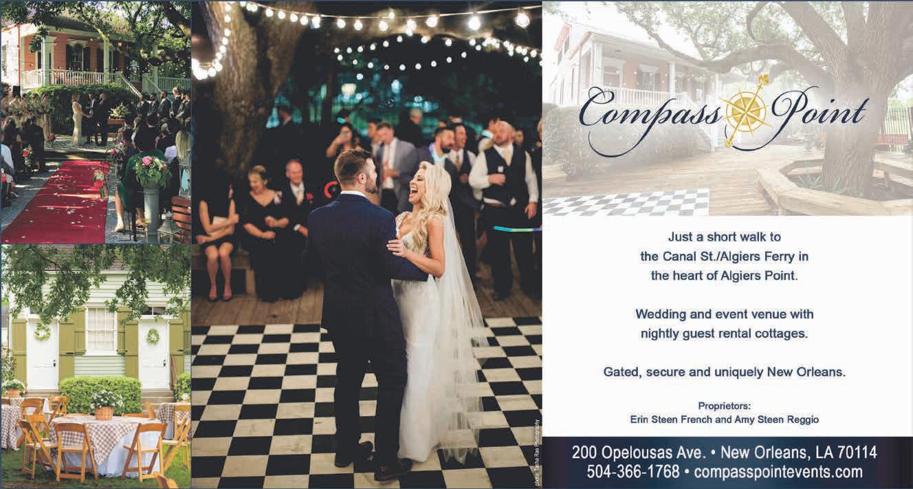 Located just minutes from the heart of Downtown New Orleans, Compass Point envelopes the history of our culturally rich city through its diverse architecture. Boasting six uniquely diferent Creole Cottages and our grand Acadian Mansion, Compass Point is quaint village within our fabulous city. Let us help you create a once in a lifetime experience for you on your most special day. We will work with you making your dreams and ideas come to life through your event. Compass Point Events can accommodate your wedding under our majestic oaks complete with an outdoor dance floor and string lights or an elegant afair in our picturesque mansion. www.compasspointevents.com.