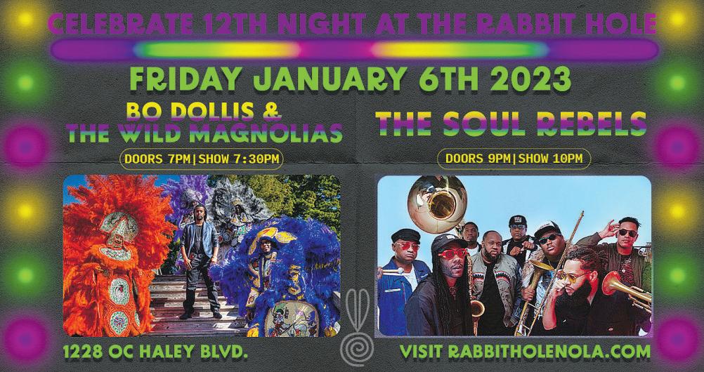 Bo Dollis Jr.and Wild Magnolias BODOLLISJR.ANDTHEWILD MAGNOLIASWELCOMETHECARNIVALSEASON with MardiGrasIndian musicatthe Rabbit Hole.The show is at 7:30 p.m. Friday, Jan.6.Tickets$15 in advancevia rabbitholenola.com